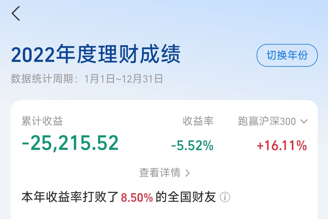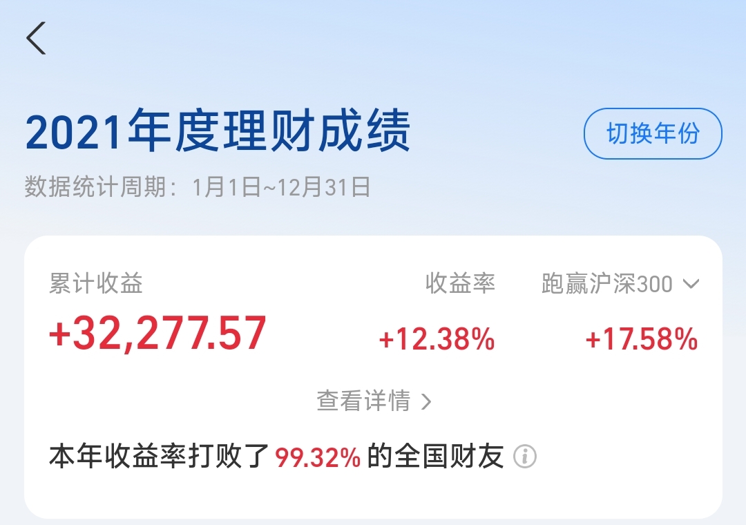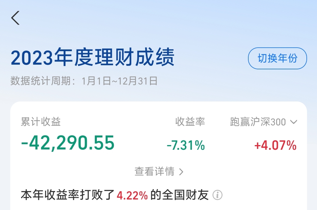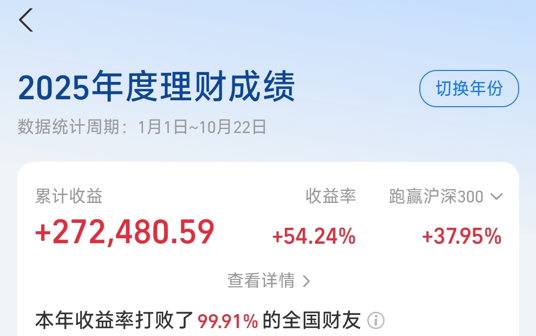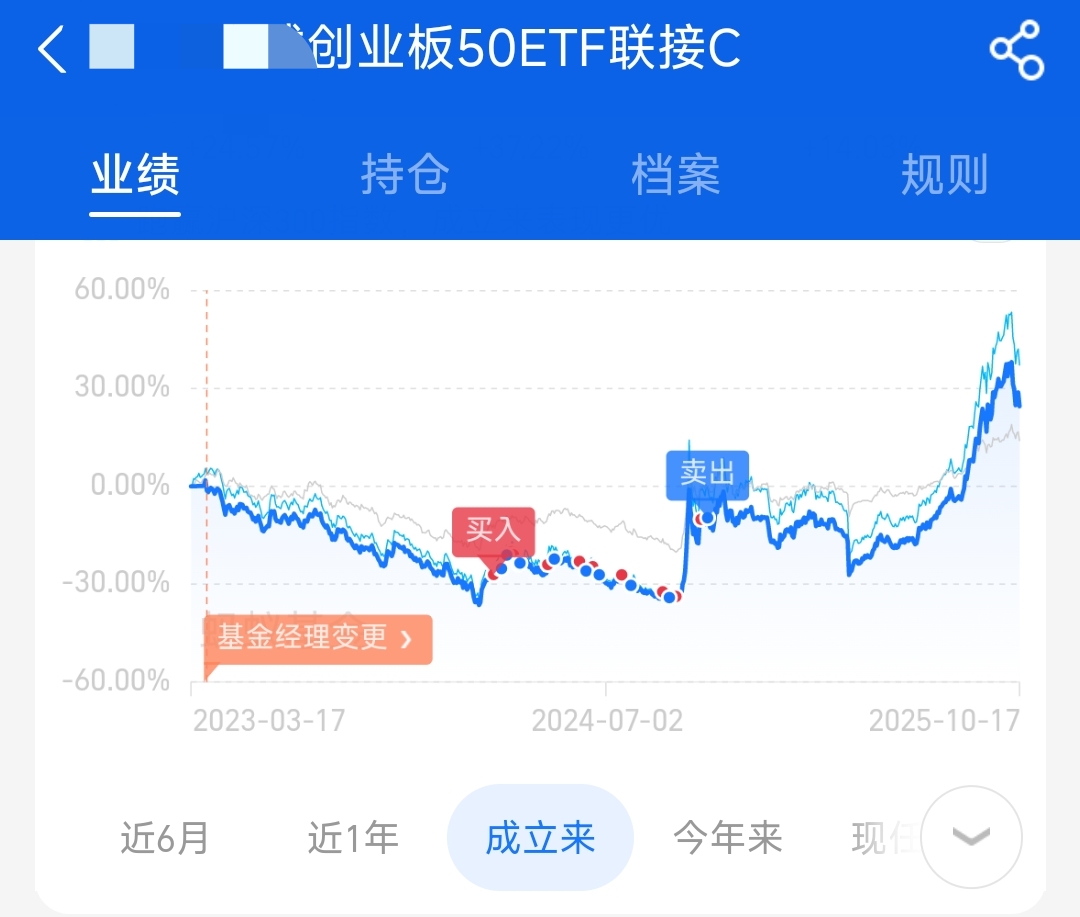 从买入到卖出的过程中指数基金跑输创业板50大约15个百分点,而当时绝大部分资金都在创业板50指数基金中,正是由于这次跑输,导致当年持仓收益率跑输了沪深300指数。在我看来每年都能跑赢沪深300就是投资水平不错的体现了,人工智能是这么描述的:“截至2025年10月,在主动权益类基金中,连续五年跑赢沪深300指数的基金数量为51只,占比2.24%。”你可以大致理解成如果连续五年每年都能跑赢沪深300,那么在基金经理这个群体中投资水平都是拔尖的。