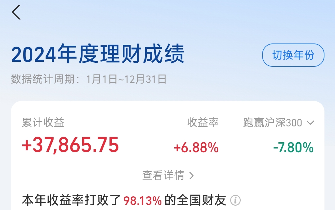 对我来说跑赢沪深300就行,并不追求绝对收益为正,2024年之所以跑输沪深300,主要还是某创业板50指数基金太不给力,在当年9月底大幅度跑输了所跟踪的指数,否则当年收益率跑赢沪深300不成问题。如下图所示: