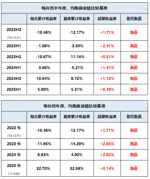 这个策略成立时间是2022年7月6日,三年间以来,每自然半年度、每自然年度都是跑赢业绩比较基准的。