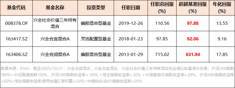 兴全合润混合A,自2013年1月29日管理至今,任职回报715.02%(同期业绩比较基准回报83.08%),年化回报17.85%。(数据来源iFinD,截至2025/10/31)