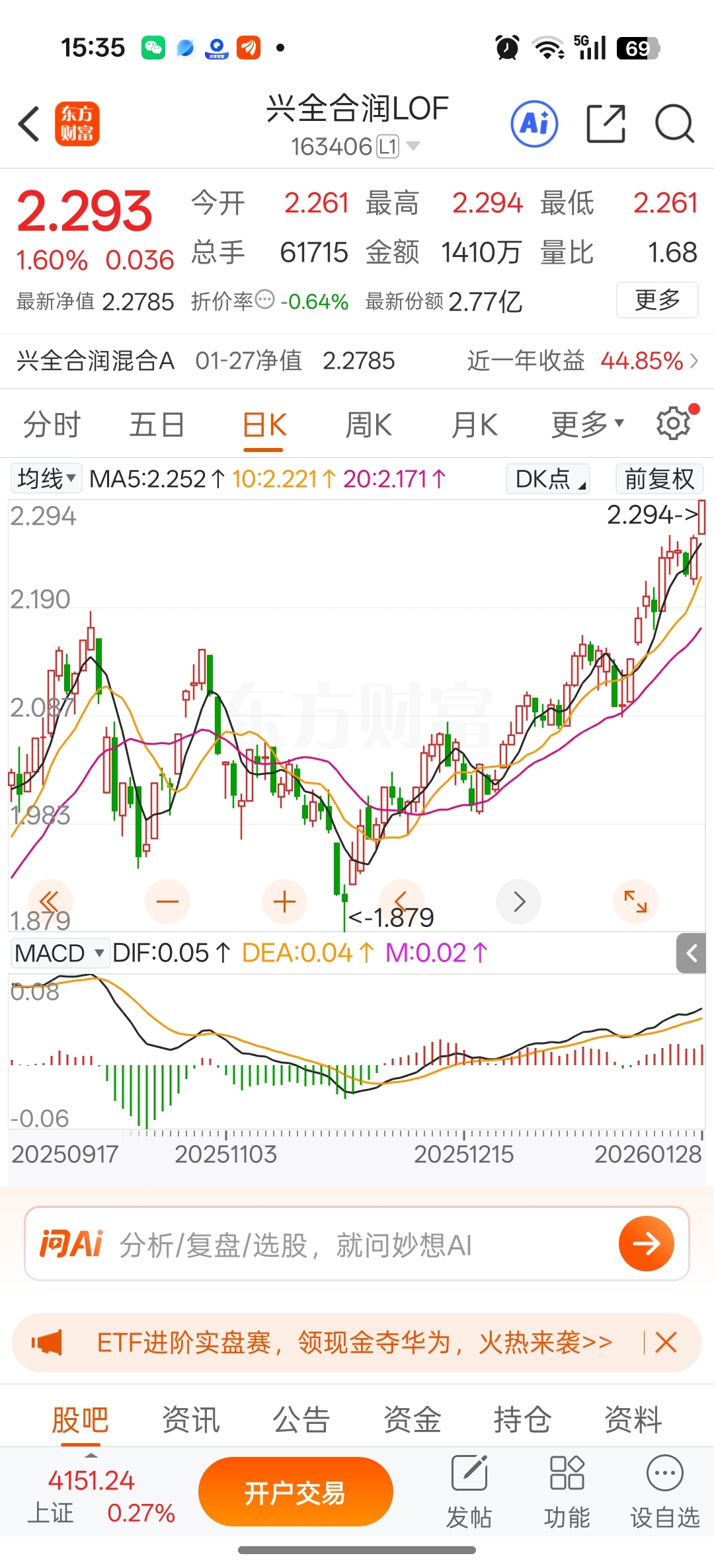$兴全合润LOF(SZ163406)$ 兴全合润是我的五大嫡系之一,买入近半年,浮盈己达40%,属于优秀基金,继续放心持有