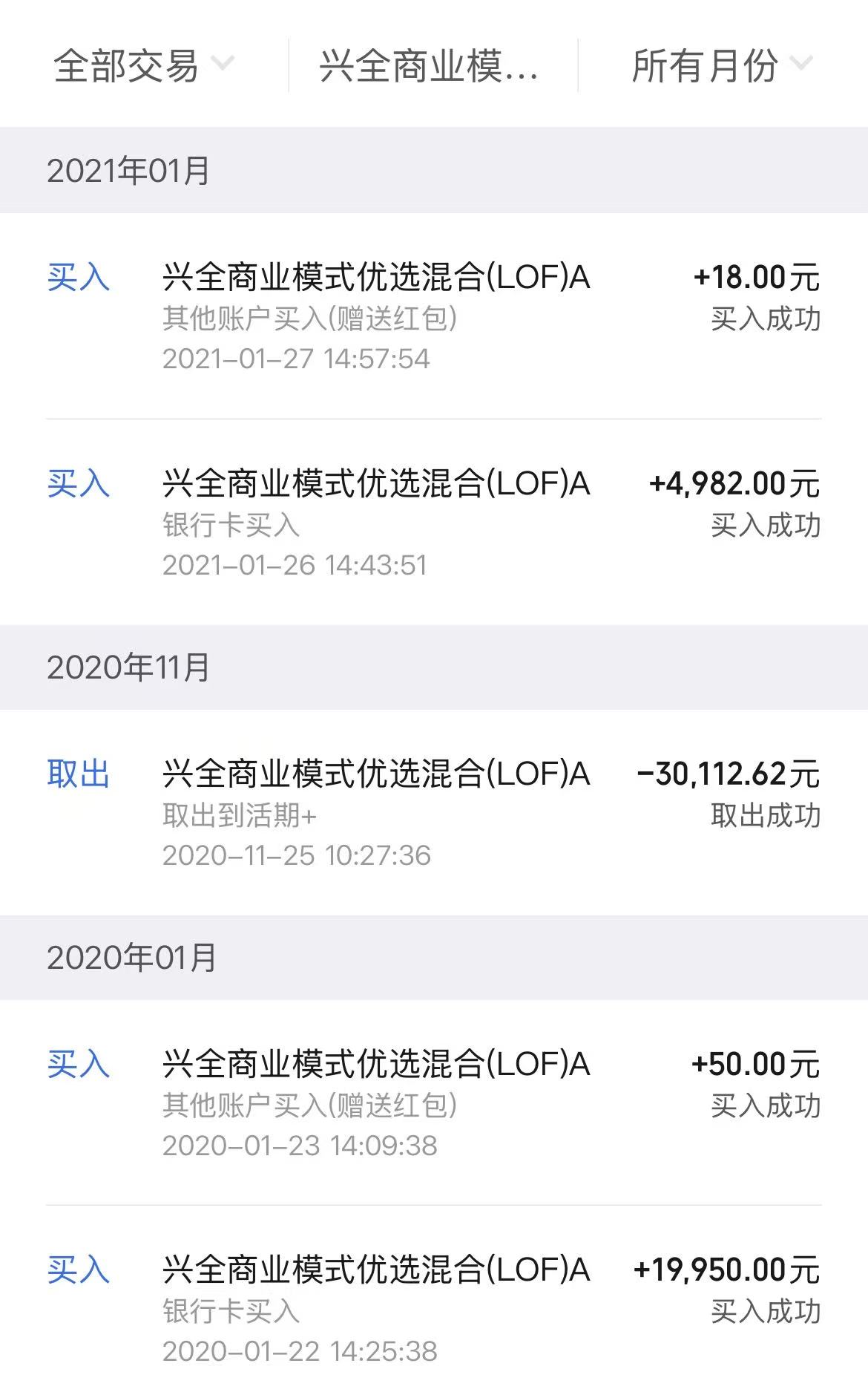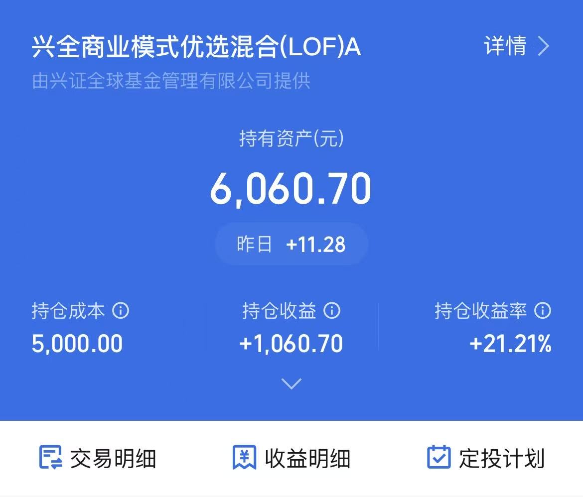 购买基金多年,会发现和基金公司或基金经理是要讲缘分的,有些基金公司可能和自己不是很合,哪怕它家某个产品在某段时间收益率非常好,但自己就是享受不到,要么不敢购买要么早早卖出,而有些基金公司管理理念和投资风格让人安心,也让投资者收益颇丰,作为兴证全球基金的忠粉,购买并持有过旗下的多个基金,如兴全趋势、兴全商业模式、兴全合润、兴全汇虹、兴全安泰、兴全沪深300等,中间过程有涨有跌,但一直有信心,比如这个兴全商业模式基金,自2021年1月26日购买,中间有浮亏,今天打开一看,竟然收益率达到21.21%,这真是意外的惊喜!