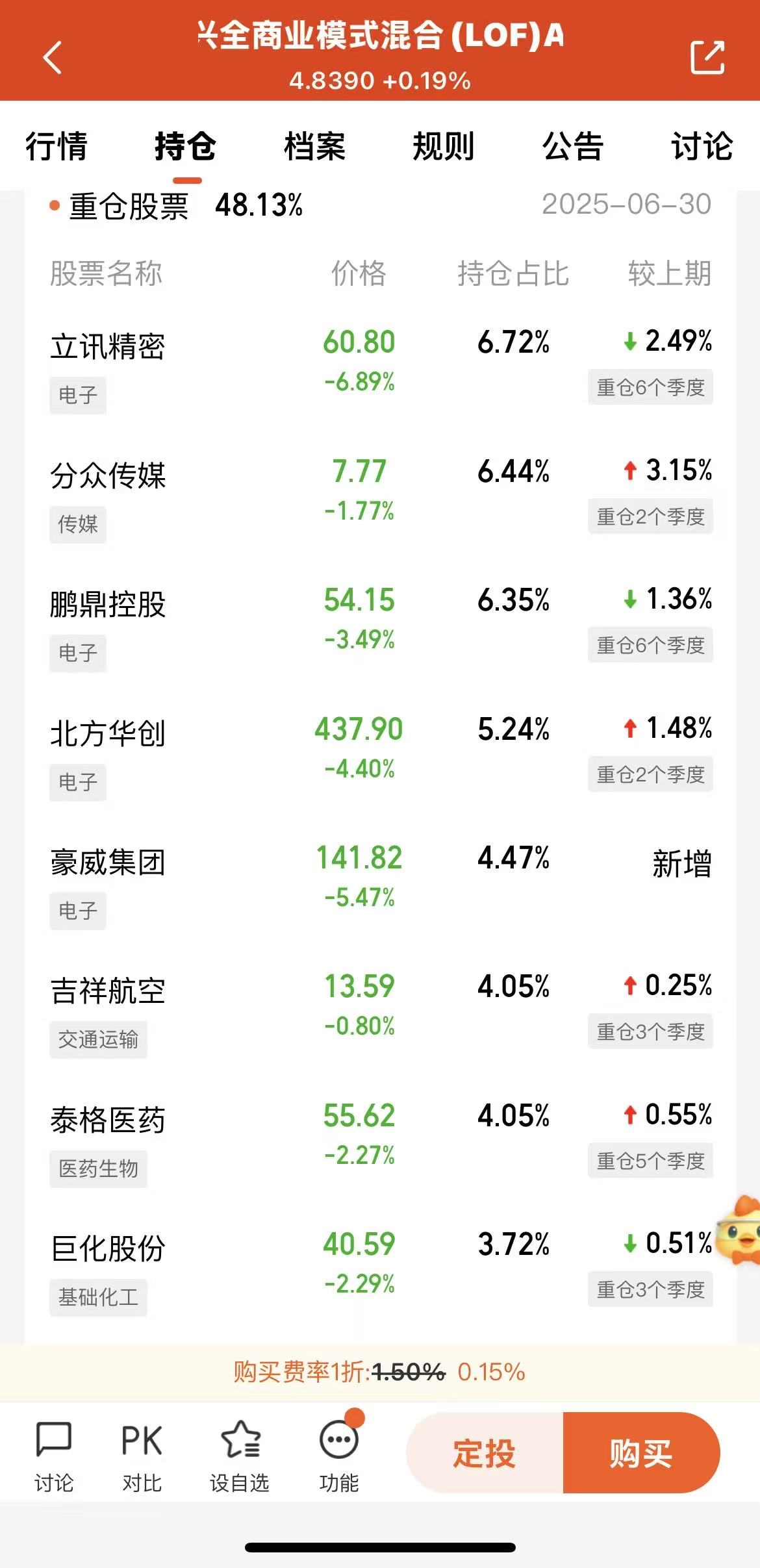 从持仓行业分类来看,2季度包括科技、医药、基建地产、消费、新能源、周期、制造和金融等板块,重仓股票则包括立讯精密、分众传媒、北方华创、吉祥航空、泰格医药、巨化股份和蓝思科技等,板块和个股都分散均衡,截至2季度,基金规模达到130.25亿,机构占比27.73%,可见群众的眼睛是雪亮的,基金深受大众欢迎;