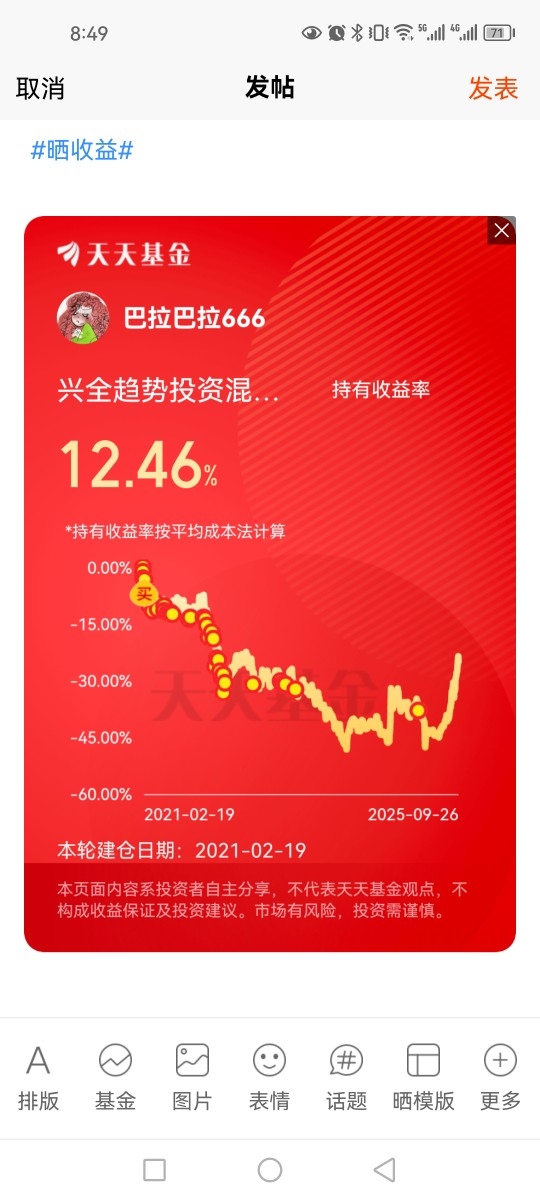 如今它给了我12.46%的持有收益率,这份成绩来之不易。在持有过程中,我深刻体会到“长期主义”的力量,也更加认可这只基金在市场判断和资产配置上的能力。
