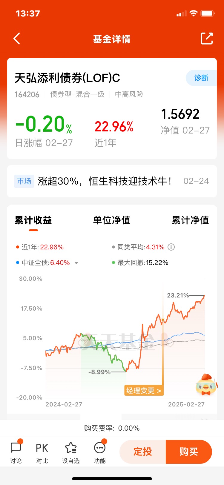 #回调!恒生科技跌超2%# #大消费逆势走强!能追吗?# #小米双Ultra发布!雷军:重新看待国产品牌# 天弘添利债券(LOF)C打卡第7天,Deepseek引领的科技行情推动了权益市场回暖,转债市场也随之放量,固收+策略的“防守反击”特性再度凸显。