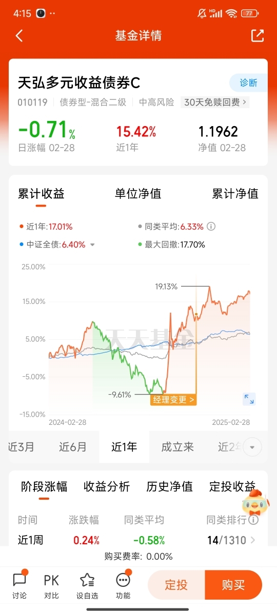天弘多元收益C同样表现出色。它是债券型 - 混合二级基金,这种独特的基金类型使其既能通过投资债券获取稳健收益,又能借助股票投资追求更高回报。基金经理杜广和余袁辉经验丰富,善于把握市场节奏。在持仓方面,股票持仓前十占比合计18.37% ,涵盖东方雨虹、江苏银行等各领域优质企业。从业绩数据来看,近1个月收益率2.45%,同类排名73|508 ;近6个月收益率更是高达28.38% ,同类排名15|482,今年以来收益率也有3.22% ,排名76|502。成立以来收益率达到17.22% ,长期业绩表现十分亮眼。