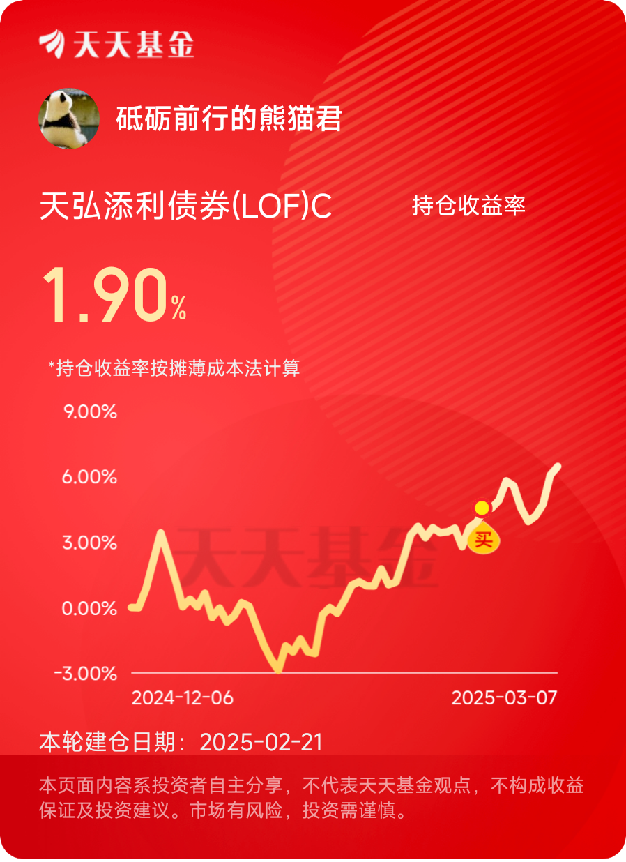 天弘添利债券,我的稳健之选!在未来的投资之路上,我将继续与它携手前行,共同书写属于我的债券投资传奇!#晒收益#