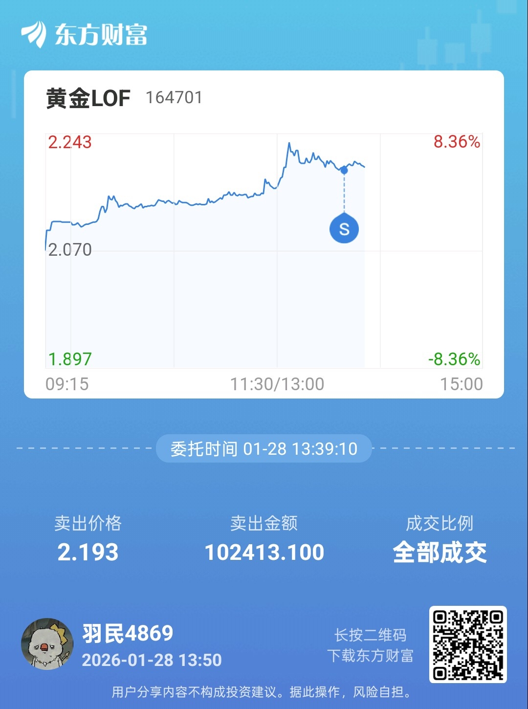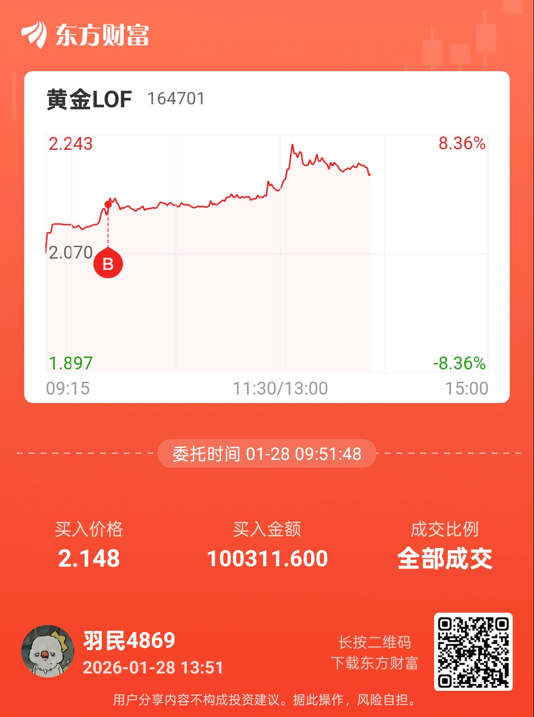 笔记:早盘时就发现了大部分在攀升,当我的国泰商品平价时,认为哪怕是名字不起眼的都能平价,那164701点黄金lof不得溢价,果断入手,买了点。赚了两个点后出手卖掉。赌对了。明天周四,第一波套利大军到达战场,为了避免接盘力量不够,今日全清仓了。如果没明天还涨,那也无所谓了。毕竟不是所有钱都有能力赚到手的。