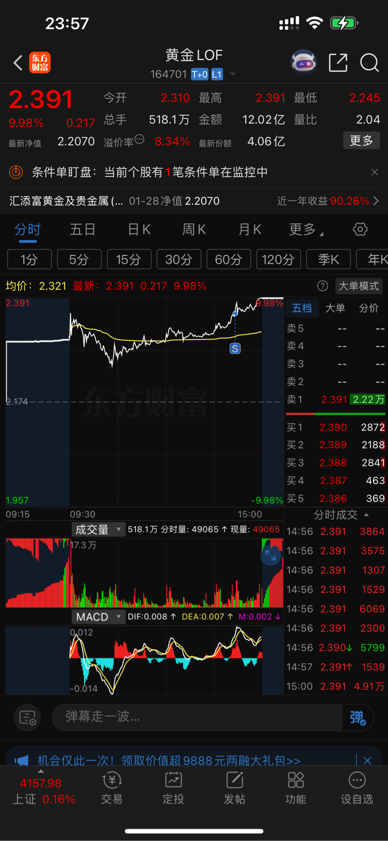 $黄金LOF(SZ164701)$ 一直在为自己做T、T飞而自责、现在看来多亏跑了一半、明天接回、妥妥的不要太舒服!