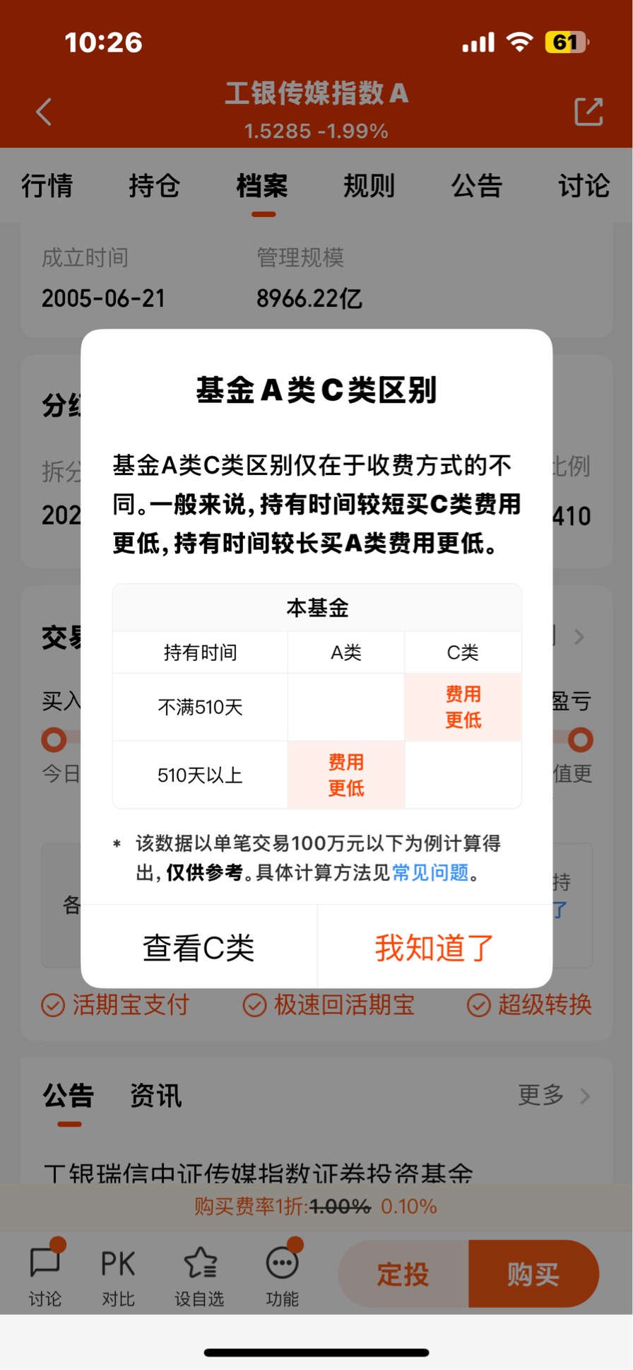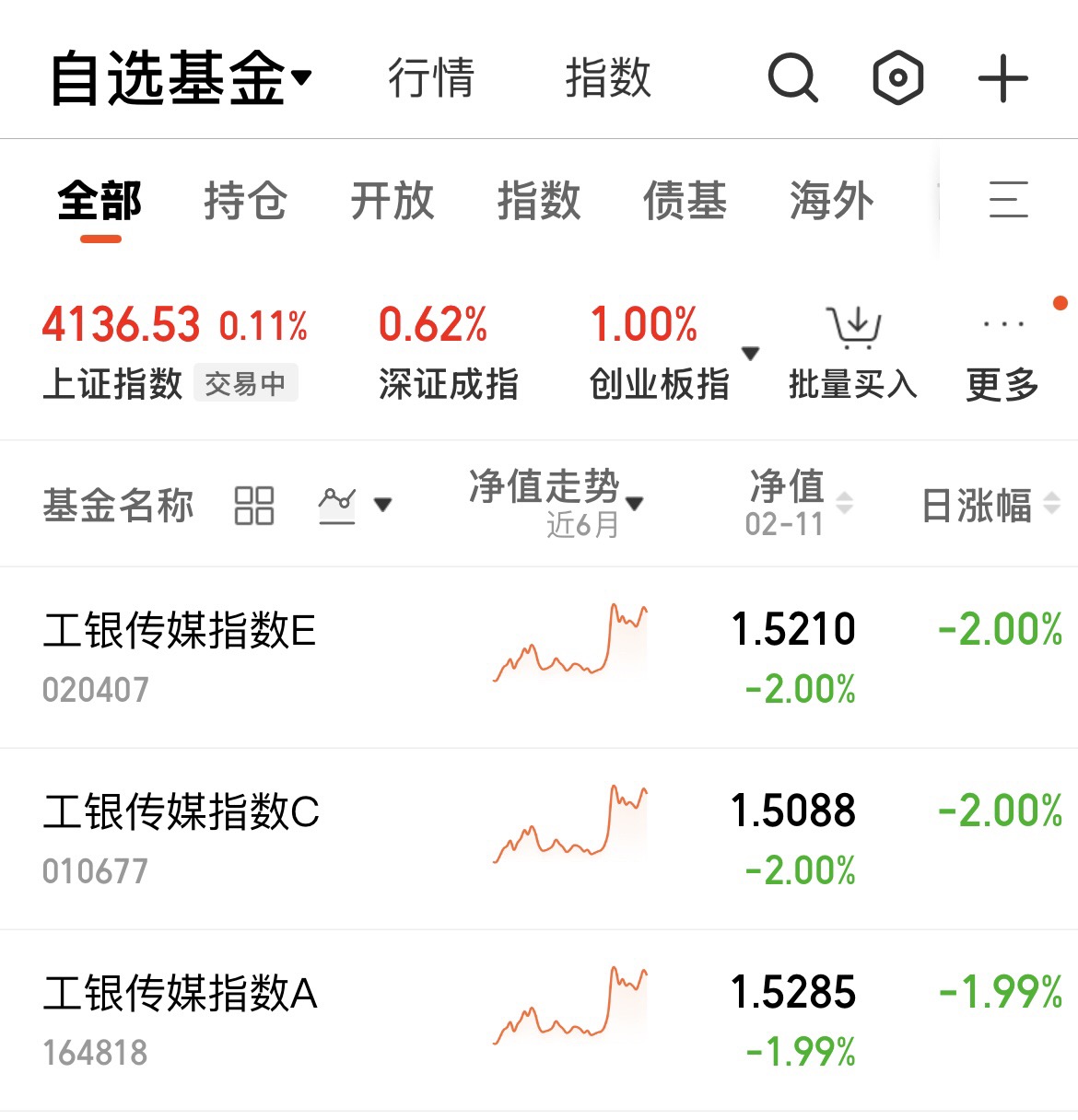 如工银瑞信旗下的工银传媒指数基金,其成分股就主要是传媒行业,除了刚才所说的光线传媒,还有分众传媒,万达电影,巨人网络,南方传媒等个股,E类近一年收益率40.9%,C类是40.89%,A类更是41.24%,其中A类长期持有更划算,短期持有则可以C、E类,后两者都不要申购费,但需销售服务费,A类持有两年以上(含两年)免赎回费,并且C类持有30天、E类持有7天免赎回费,