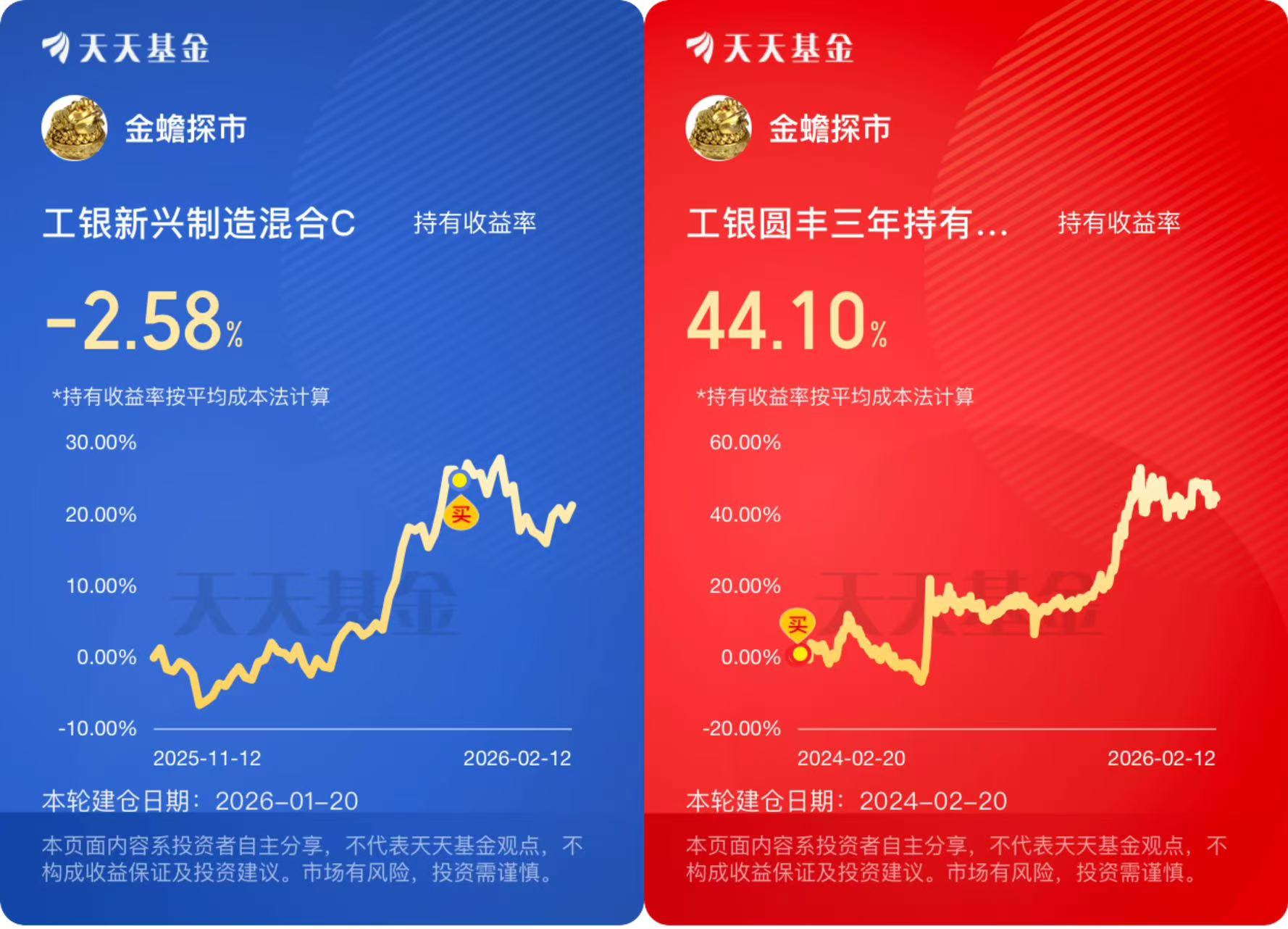 然后是工银圆丰三年持有期混合,这只基金是中高风险,比新兴制造那只波动要小一点,2月11号只跌了0.29%,但它的净值目前是0.7797,不过我的盈利已有44.1%。不过它是三年持有期,当初买的时候就知道,流动性差一点,不能随时赎回,也做好了长期持有的准备。它近一年涨了28.20%,虽然不如新兴制造那只涨得多,但胜在稳一点。我持有这两只基金,其实是想做一个简单的搭配,一只偏激进一点,一只偏稳健一点,平衡一下风险,毕竟我这种普通投资者,最怕的就是把鸡蛋都放在一个篮子里,亏得太惨。