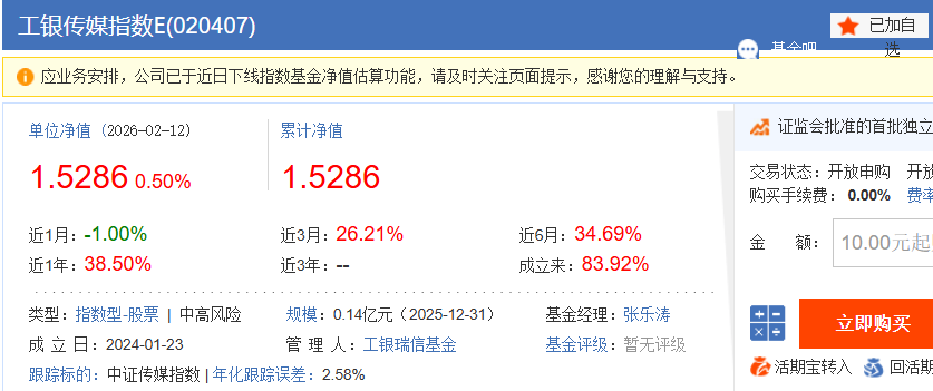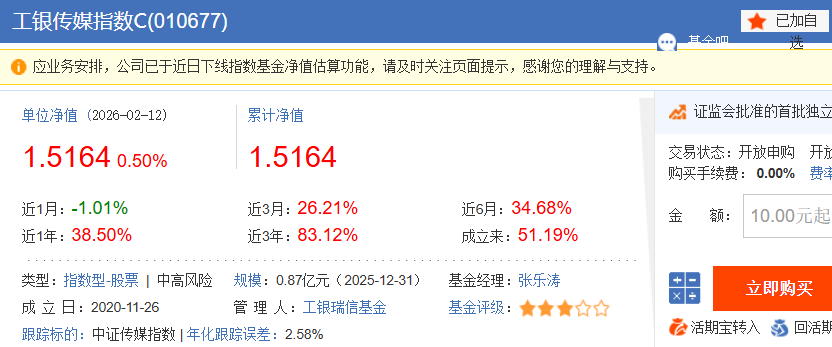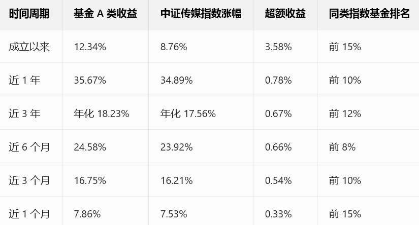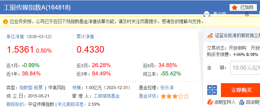 成立日期:2015 年 5 月 13 日,截至 2026 年 2 月,已经成立 10 年零 9 个月,是 A 股市场上最早成立的传媒主题指数基金之一,完整经历了传媒板块的牛熊周期,见证了行业的高峰与低谷,运作极其稳定,不是没经过市场考验的新基金;