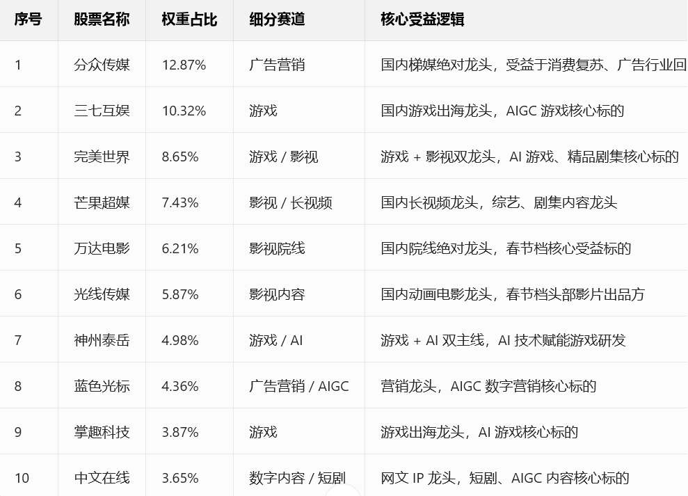 全赛道覆盖,不错过任何行情:不管是春节档影视行情,还是游戏版号利好,还是短剧出海爆发,还是广告营销复苏,还是 AIGC 技术催化,指数的权重股都能全面覆盖,只要传媒板块有行情,指数就能跟上,绝对不会出现 “板块涨了,你买的个股不涨” 的尴尬情况;