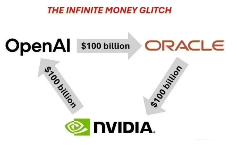 当地时间2025年9月22日,英伟达宣布对OpenAI最高1000亿美元的投资计划,完成了这一闭环。此前,OpenAl因算力需求向甲骨文下了千亿美元数据中心订单,甲骨文则需要向英伟达采购数百亿美元的AI芯片,而英伟达再将部分利润以战略投资的形式返还给OpenAl,形成了“openAl付钱给Oracle买算力,Oracle拿钱向英伟达买芯片,英伟达再把赚到的钱投资给OpenA!”的资本循环。