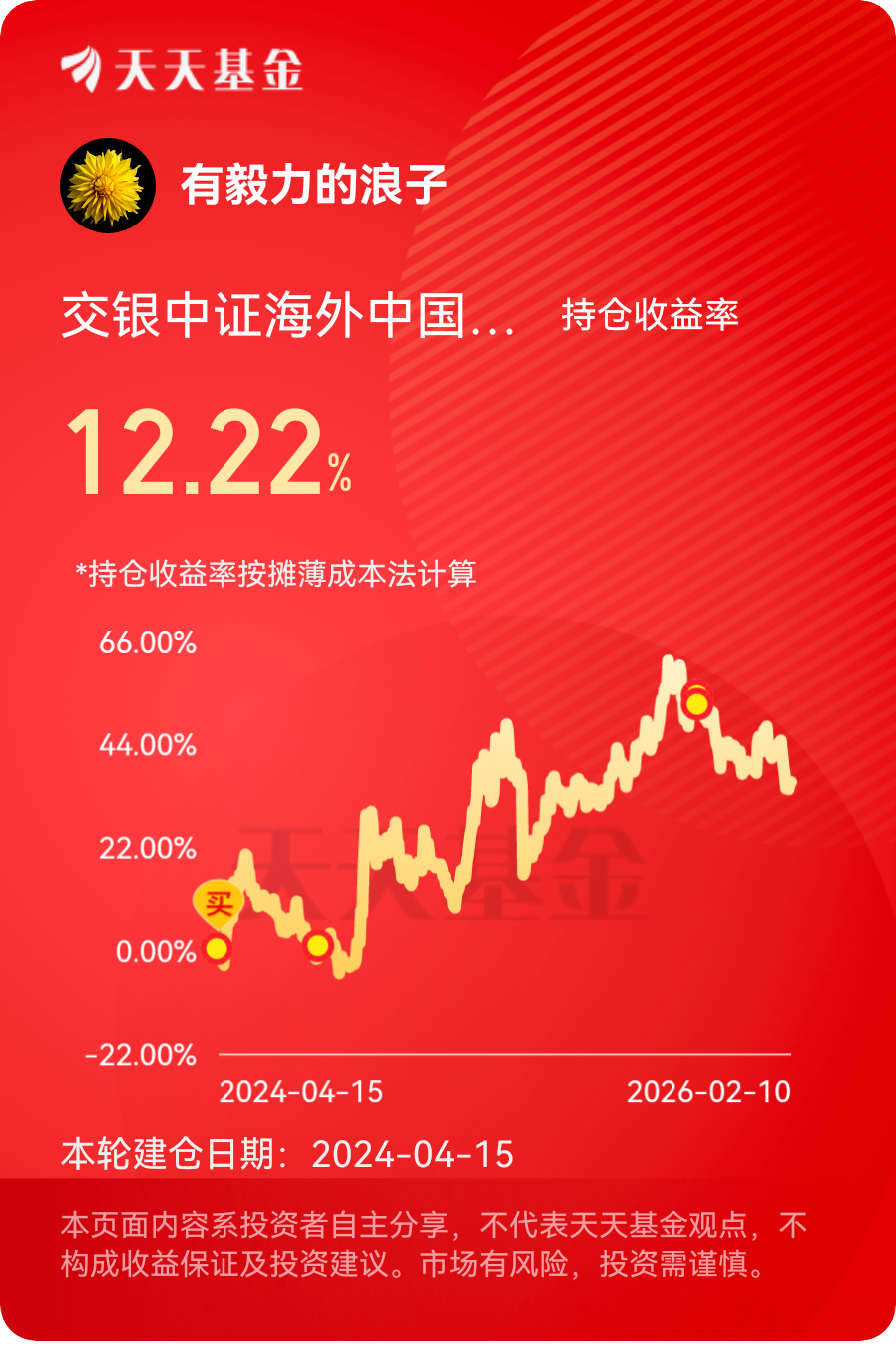 最近震荡有点厉害,海外互联网估值不高,定投继续了$交银中证海外中国互联网指数(LOF)A$ #晒收益#