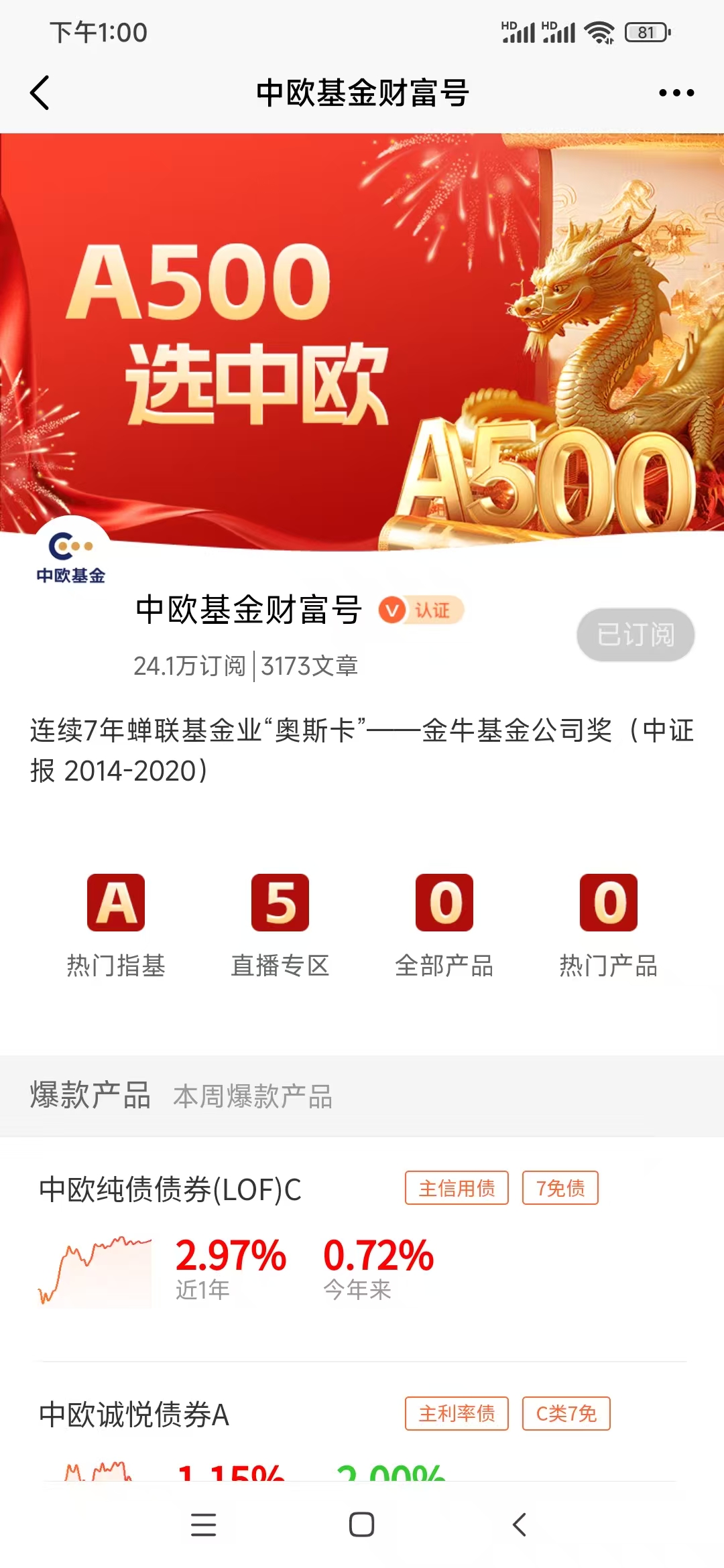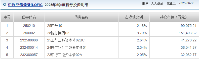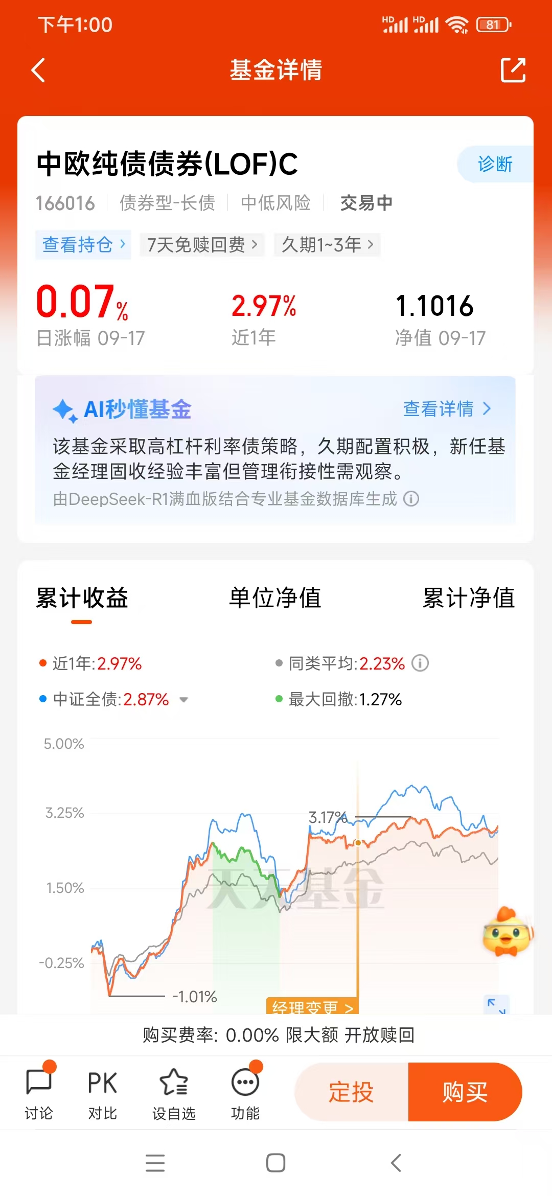 以中欧纯债债券(LOF)C(166016)为例,它的持仓以信用债为主,利率债为辅,近一年取得了2.97%的涨幅,相对稳定且持续的收益让它成为一个适合“防守”型投资者的选择。