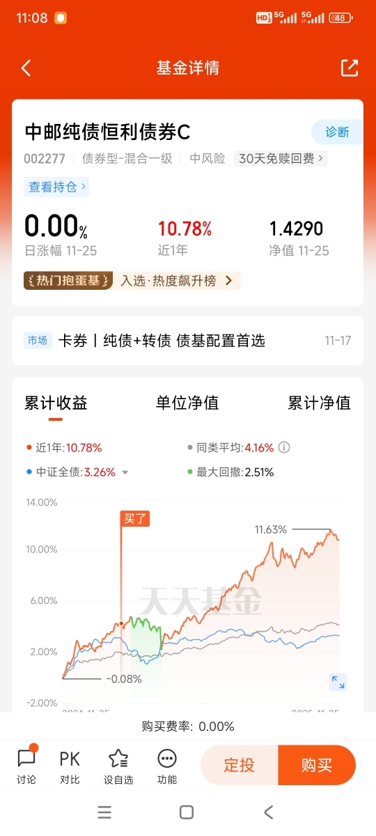 从纯债切混债怕波动?选$中邮纯债恒利债券C$就对了!只投可转债和纯债超稳健,近半