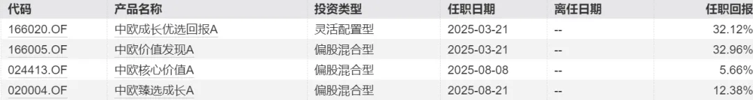 首先介绍中欧基金的柳世庆。他于2024年从民生加银离职后加入中欧基金,今年3月开始管理中欧价值发现和中欧成长优选回报,8月又接手了中欧核心价值和中欧臻选成长。