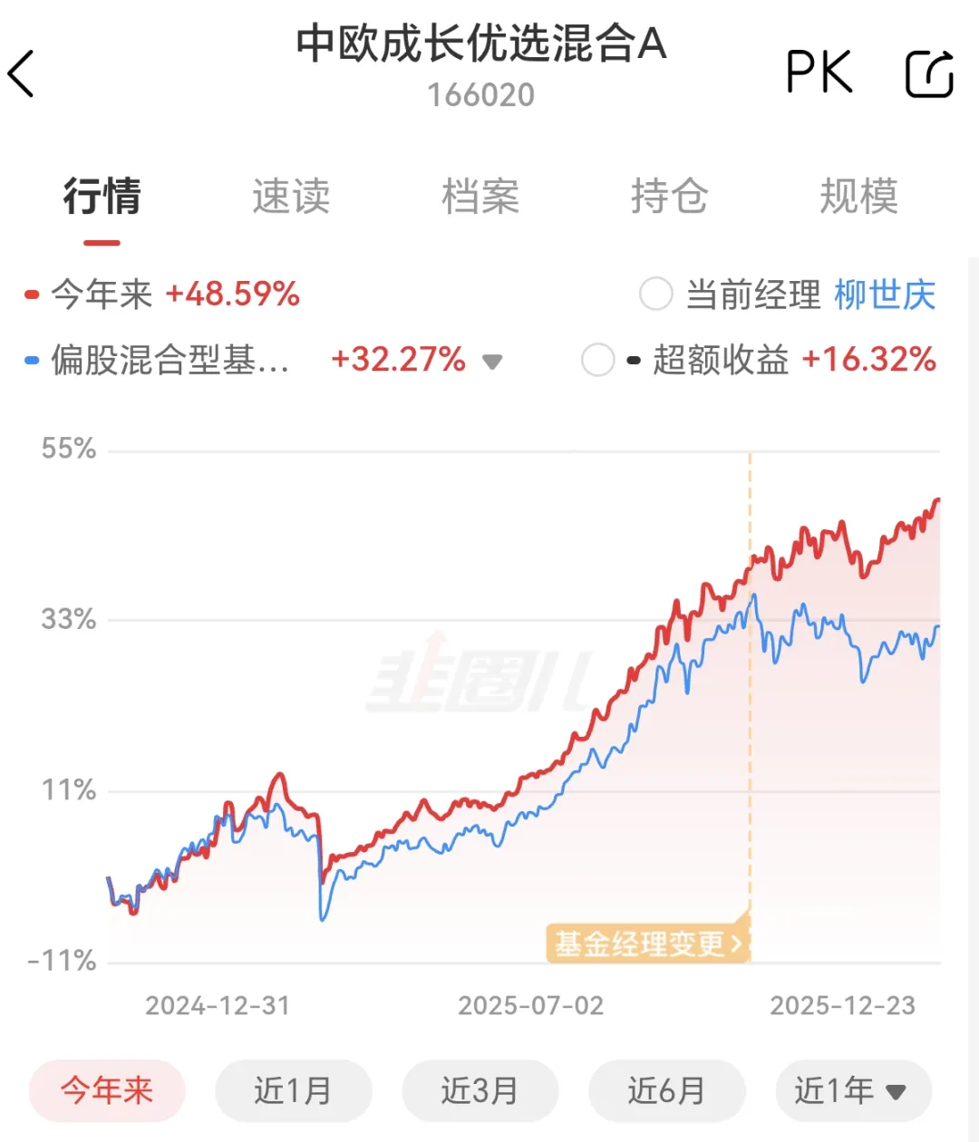 今年同样遇到成长风格占优的市场环境,以中欧成长优选为例,截至目前收益48.59%,柳世庆任职以来收益32.12%,同期偏股混合指数22.46%,超额收益能力突出,净值曲线非常平稳,近期也创了新高。