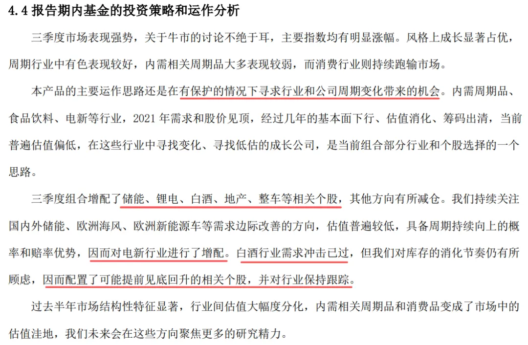 在结构性行情中他更倾向于选择现阶段相对低估的品种。比如三季度新增了白酒(酒鬼酒)和电新(锂电、光伏、风电)等板块个股,判断这些行业处于周期底部区间,看重赔率,相比股价表现,他更愿意买在左侧。