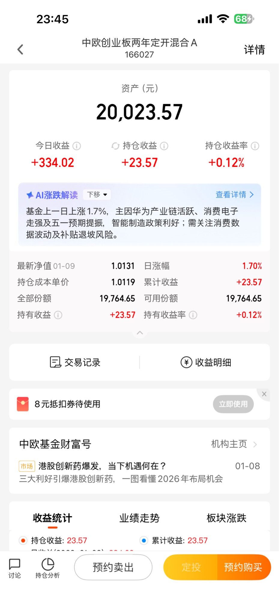 $中欧创业板两年定开混合A$持仓2006天终于是有收益了,盈利23.57,还卖不