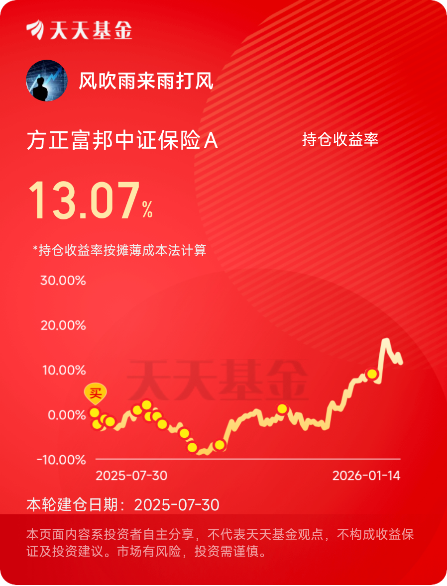 持有保险最让人安心的,是那份不慌不忙的心态。不用天天盯着行情,也不用因为外界变化就手忙脚乱。这份从容,来自对未来的清晰安排。耐心一点,你收获的不只是账户数字的增长,更是生活里那份踏实和自在。$方正富邦中证保险A$ #晒收益#