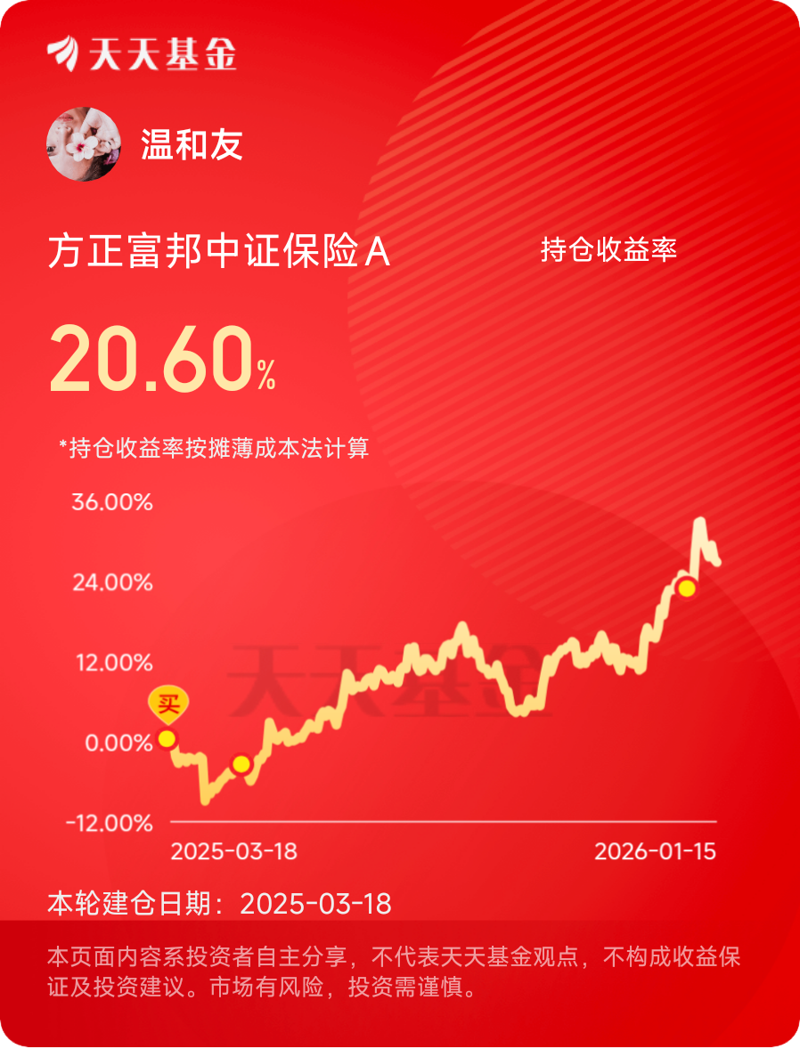 #晒操作# 最近保险板块经历了一轮调整,但从基本面来看,行业的长期逻辑其实没变。我国的保险深度和密度在全球范围内仍处于较低水平,随着人口老龄化趋势加深,大家对健康、养老等方面的保障需求只会越来越强。再加上政策层面一直有明确支持,眼下这个回调阶段,对长期投资者来说反而是个不错的观察和布局时机。$方正富邦中证保险A$ #晒收益#