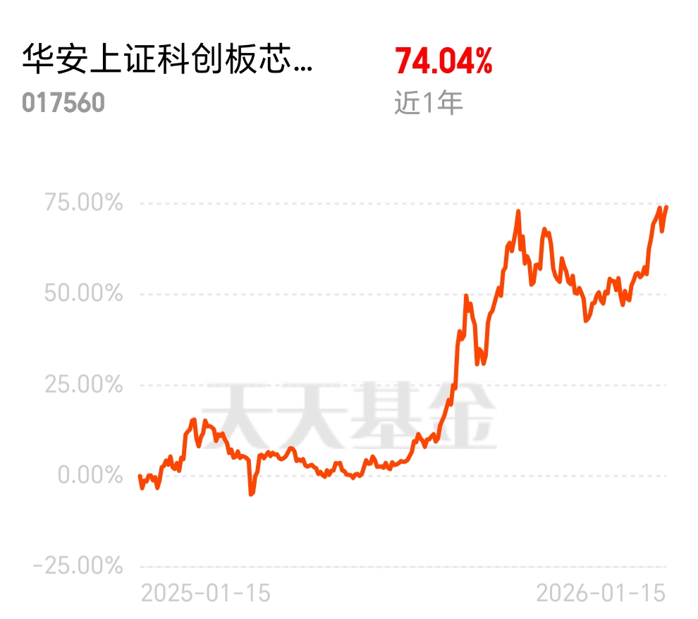 硬科技行情太燃了,$华安上证科创板芯片ETF发起式联接C$ 近 1 年斩获 74.04% 收益,覆盖芯片全产业链,C 类灵活进出成本低