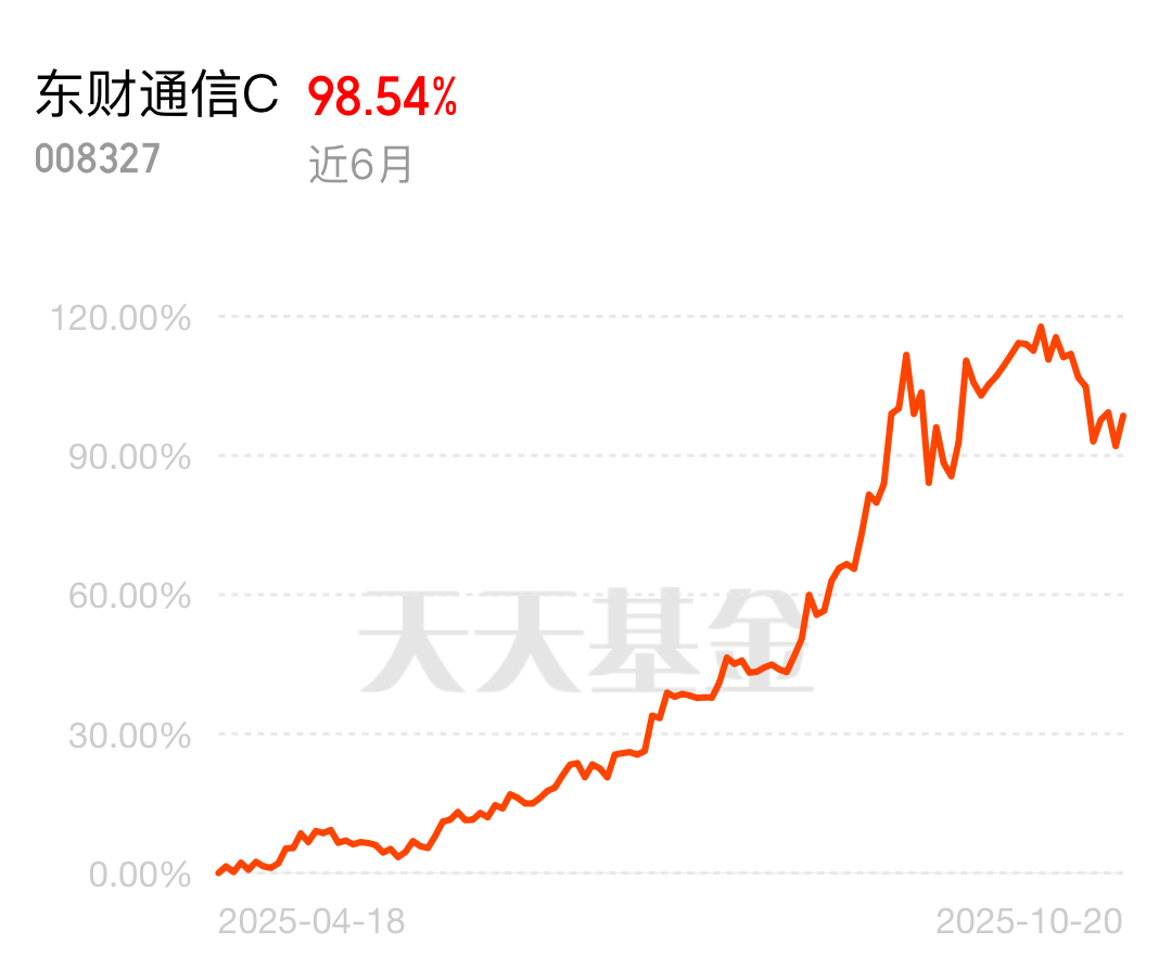 光模块估值低成长性高,CPO技术又领先,简直是完美赛道。东财通信C全给你覆盖,近6个月98.54%的涨幅,闭眼买都赚。