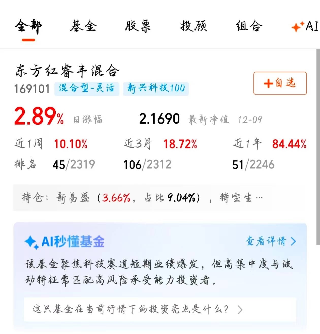东方红睿丰近期表现真不错,一周收益10个多点,半年直奔70%以上,聚焦科技领域能