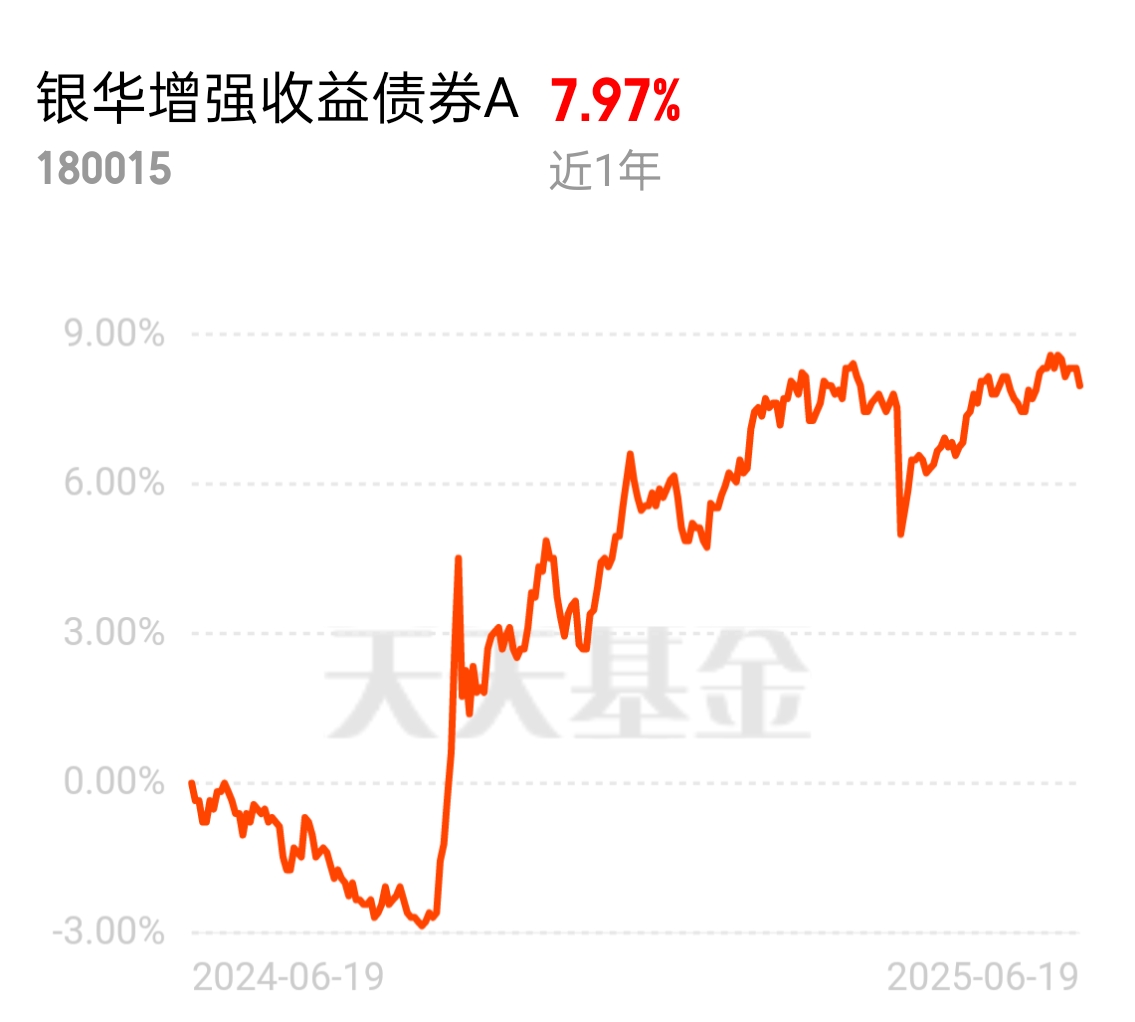 这只债券有转债,进退攻守平衡,一年收益率近8个点,还是非常不错的,考虑上车试试。$银华增强收益债券A$#创新药连续走弱!倒车接人or止盈信号?#