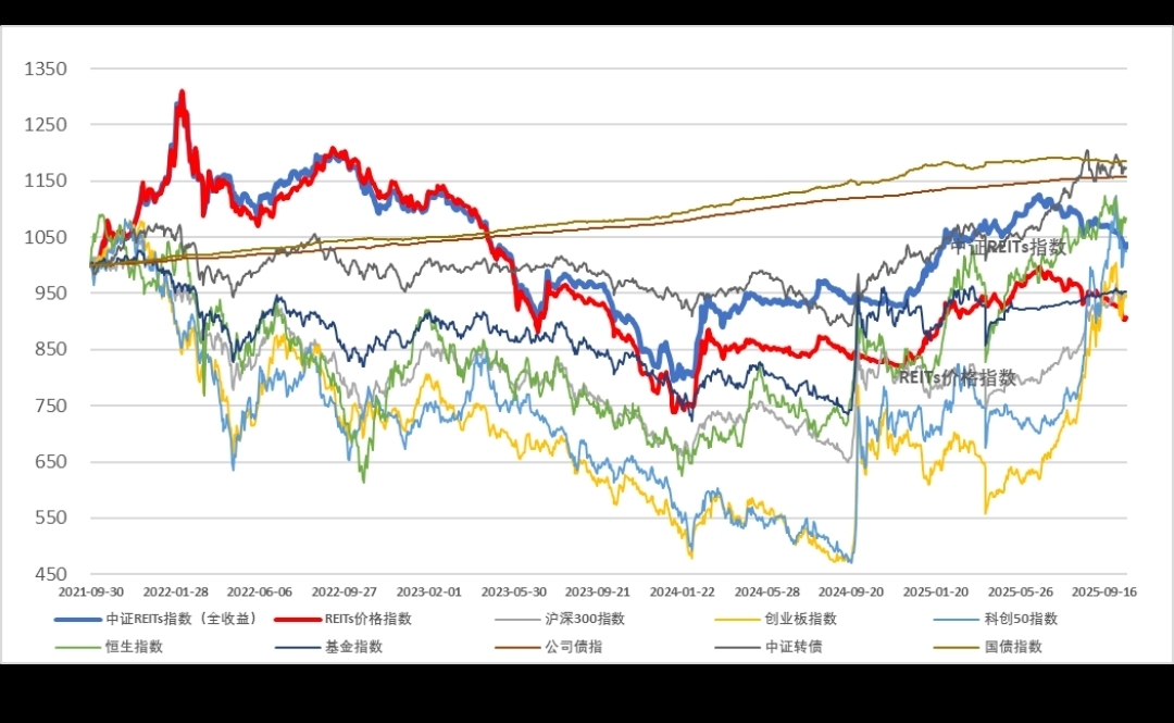 图表2 中证REITs指数、REITs价格指数及比较指数的走势图(2021.9.30—2025.10.23)