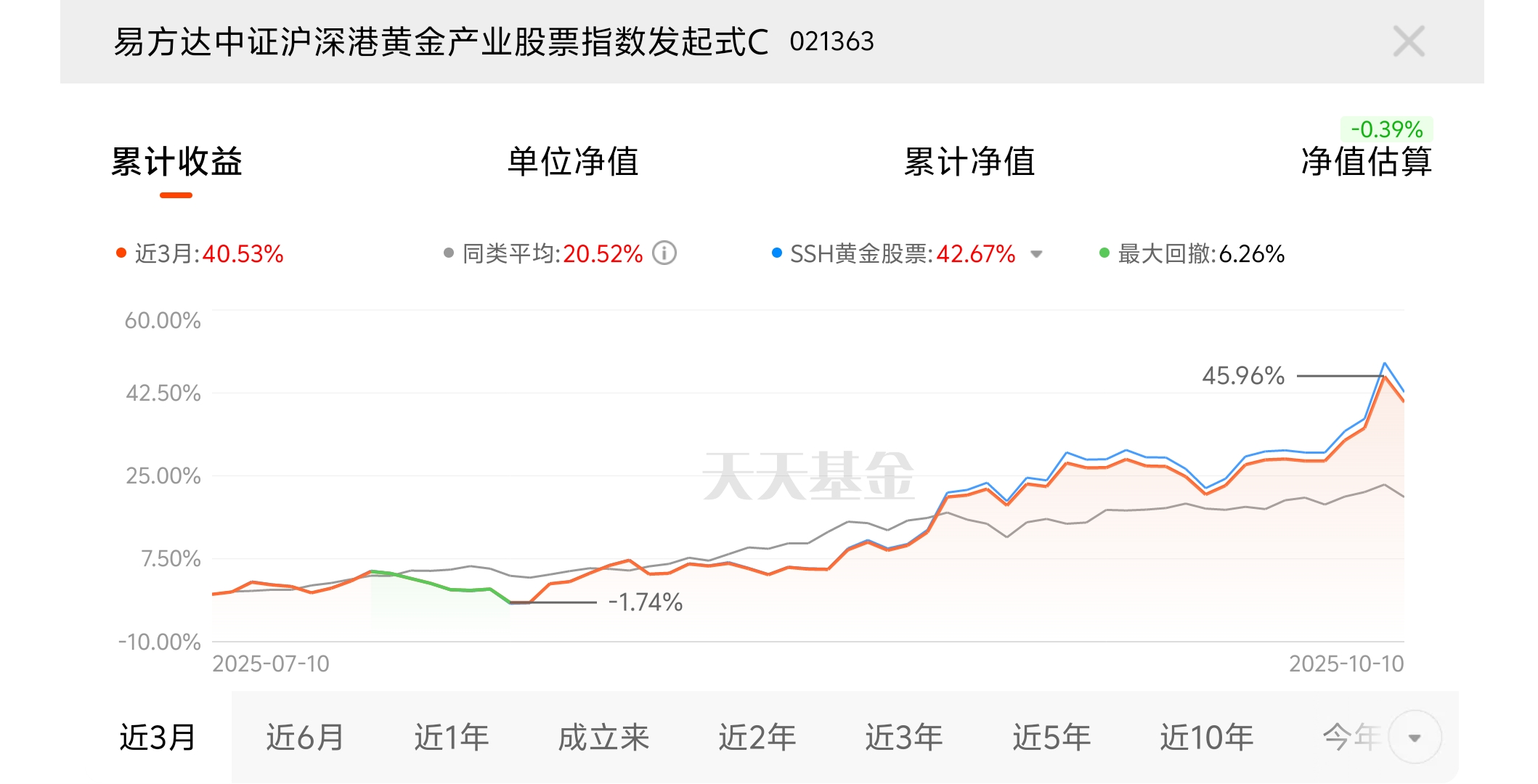 黄金产业的业绩都在改善,反映到盘面上就是涨,行情很健康。易方达中证沪深港黄金产业股票指数C近3个月40.53%,现在上车正合适,不早不晚。