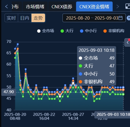 DR001报1.30%左右,DR007报1.43%左右,资金情绪均衡偏松(CNEX资金面情绪指数在49)