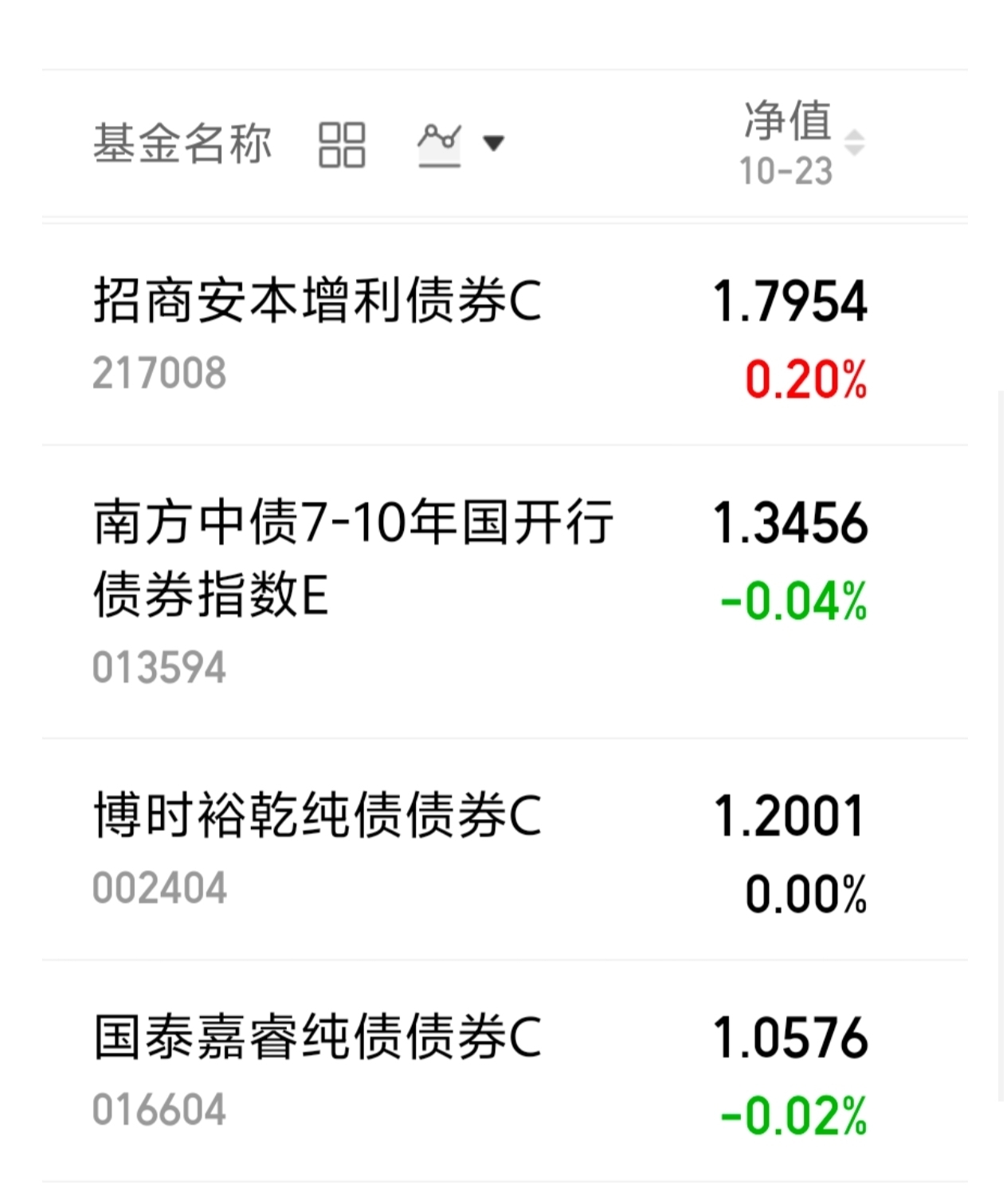 具体看看几只债基的表现:招商安本增利债券C昨天涨了20个蛋,这个涨幅真不错;博时裕乾纯债债券C昨天不涨不跌,收了0蛋;国泰嘉睿纯债债券C昨天跌了2个蛋;南方中债7-10年国开行债券指数E昨天表现稍差,跌了4个蛋。