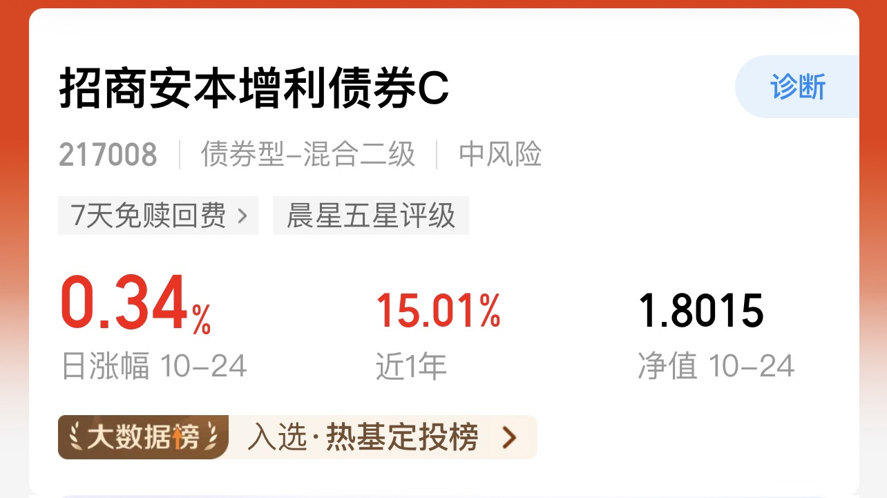 招商安本增利C上周五净值上涨0.34%,稳健表现再添一笔。之前持有招商家的纯债基金体验不错,这次趁着权益市场表现火热,我也来体验下“固收+”的魅力。 当前市场情绪回暖,固收+策略或正处在一个兼顾安全与弹性的好窗口。稳中求进,继续观察表现。