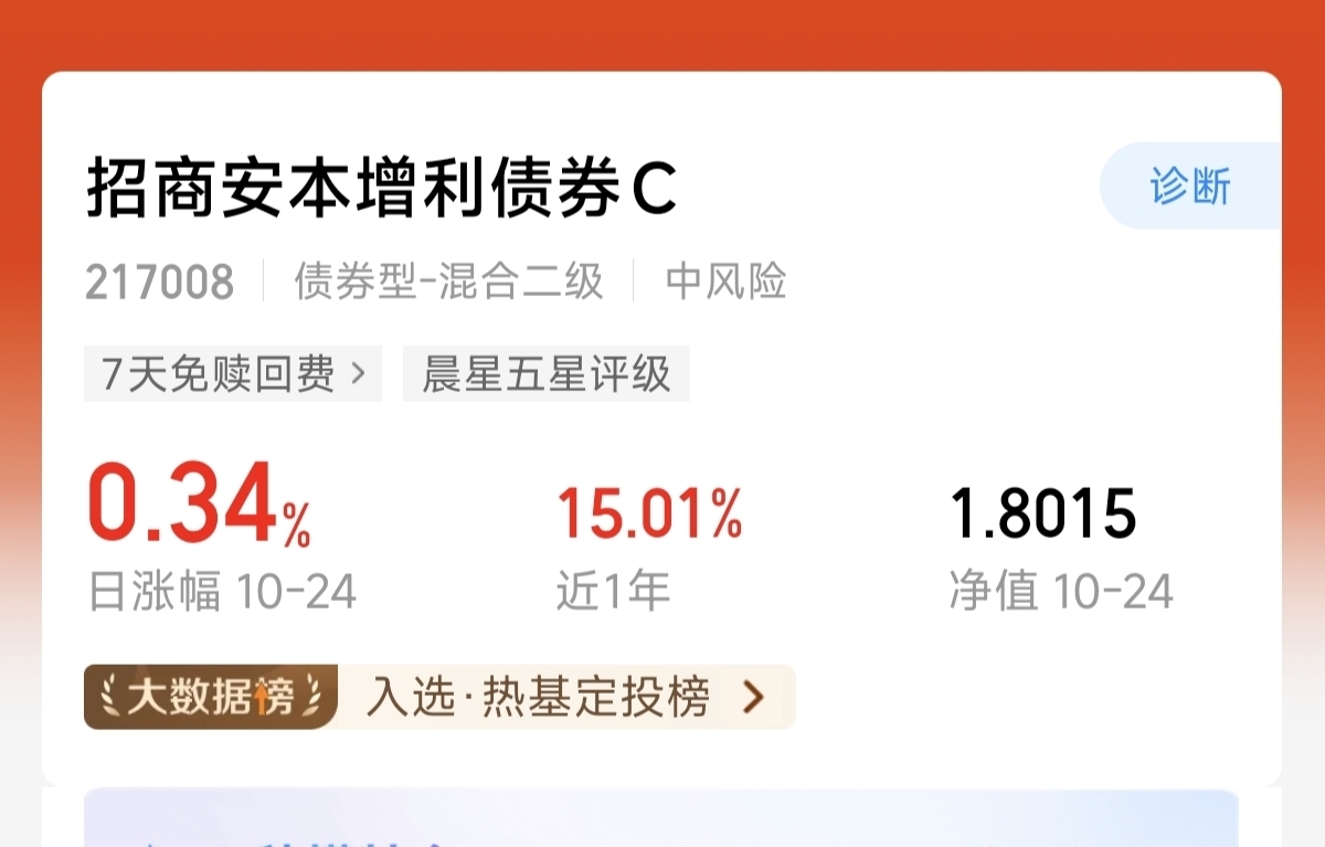 今天双收了呀,大盘创出了新高。债券市场尾盘也开始拉伸,$招商安本增利债券C$ 这只稳定的固收,周五又收了34个蛋。近一年收益率达到了15.01%。长期做到了涨多跌少。一直在不断创新高。今天继续期待收大蛋。