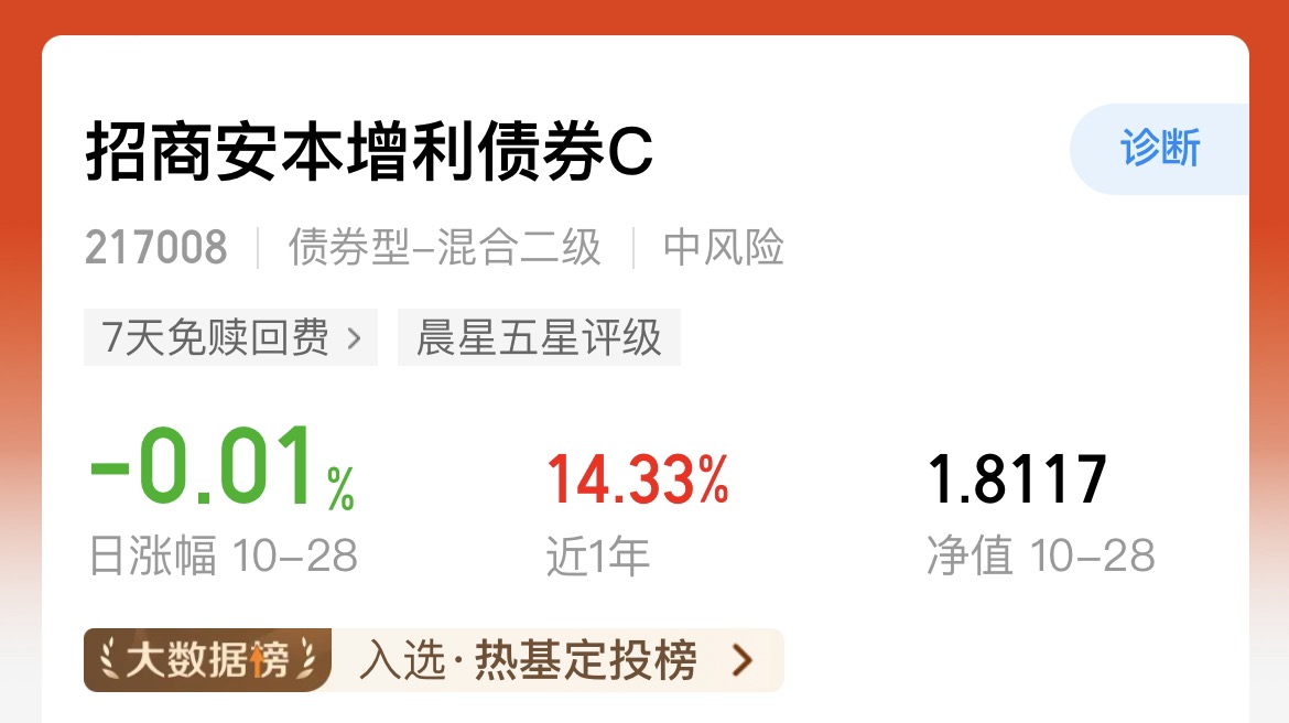 兄弟们,挖到一只超有潜力的基金,最近A公子那边波动还是挺大的,板块轮动也是快的飞起。我想了一下,打算去债券市场这边来找个稳当点的来当我的底仓。刚好看到了这个$招商安本增利债券C$
