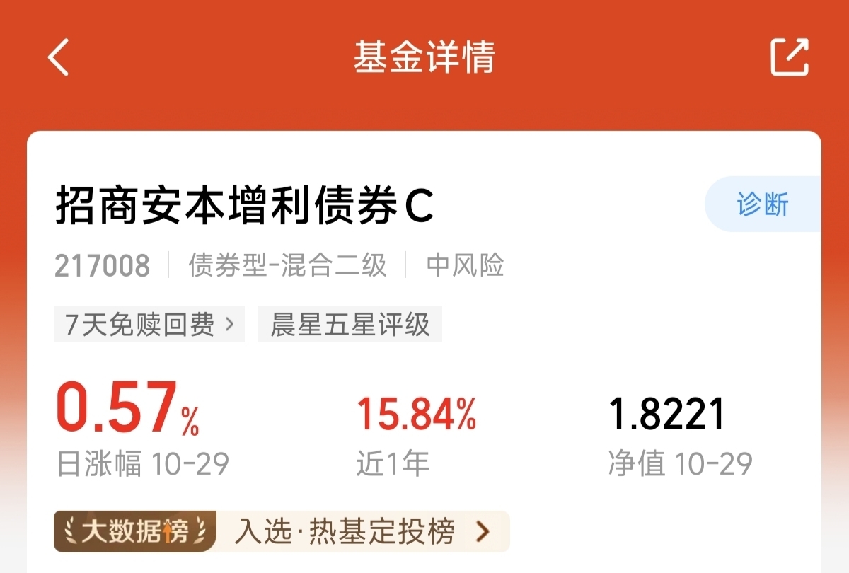 目前来看,在权益震荡上行的节奏下,还是混债表现更强。$招商安本增利债券C$ 这只稳定的固收+,最近表现真的是每天有惊喜。昨天再收了57个蛋,又创新高了呀。近一年收益率15.84%。而且遇到波动,稳定性也不错。期待继续突破。