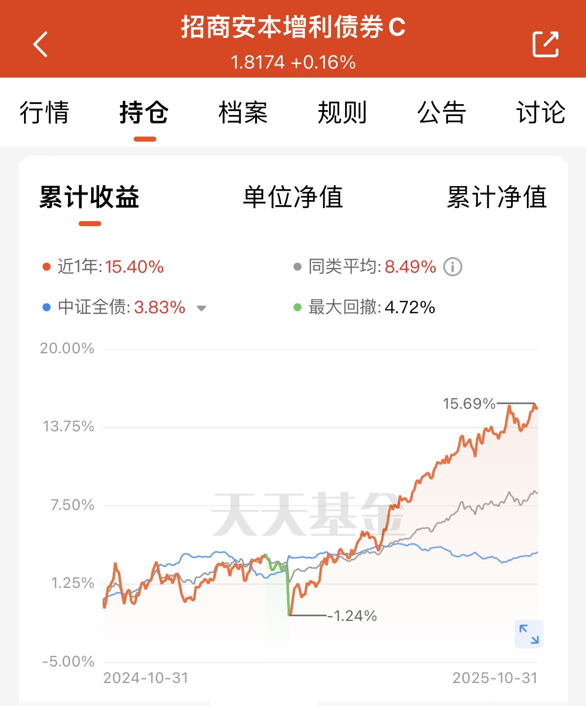 最近权益市场波动还是挺大的,我打算配置一点债券,我发现这个$招商安本增利债券C$ 好像还不错,十月已经完美收官了,这个基金上个交易日收了16个蛋,看来在市场中还是混债比较强一点。