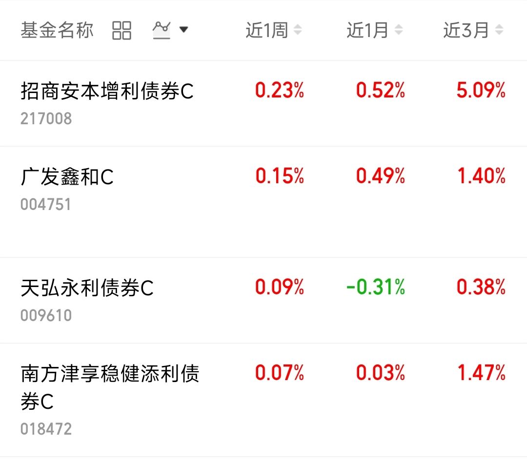 理财追求的就是稳健,当权益市场获利后,我会去优化仓位,选择部分债券基金压实底仓,需要连续表现,查看近一周收益,$招商安本增利债券C(OTCFUND|217008)$近一周收了23个蛋,$广发鑫和C(OTCFUND|004751)$近一周收了15个蛋,$天弘永利债券C(OTCFUND|009610)$近一周收了9个蛋,$南方津享稳健添利债券C(OTCFUND|018472)$近一周收了7个蛋。