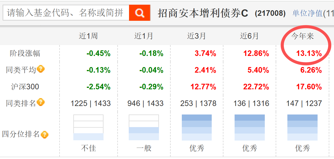 我挖掘到一只二级债基$招商安本增利债券C(OTCFUND|217008)$,今年竟然有13.13%的涨幅!