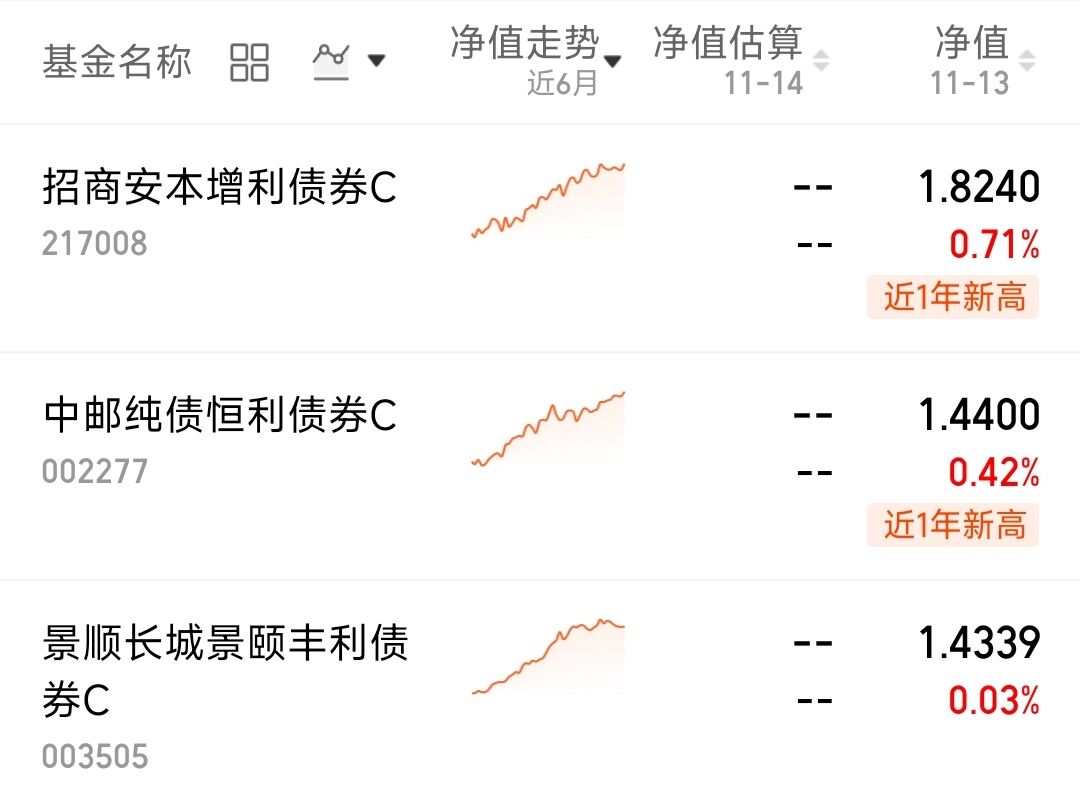 我理财准求稳健,闲钱想稳健增值,又不想锁太久?偏债基金合适!灵活又稳健,收益不落后,所以我关注这3个基金。$招商安本增利债券C(OTCFUND|217008)$昨日上涨0.71%,$中邮纯债恒利债券C(OTCFUND|002277)$上涨0.42%,$景顺长城景颐丰利债券C(OTCFUND|003505)$上涨0.03%。