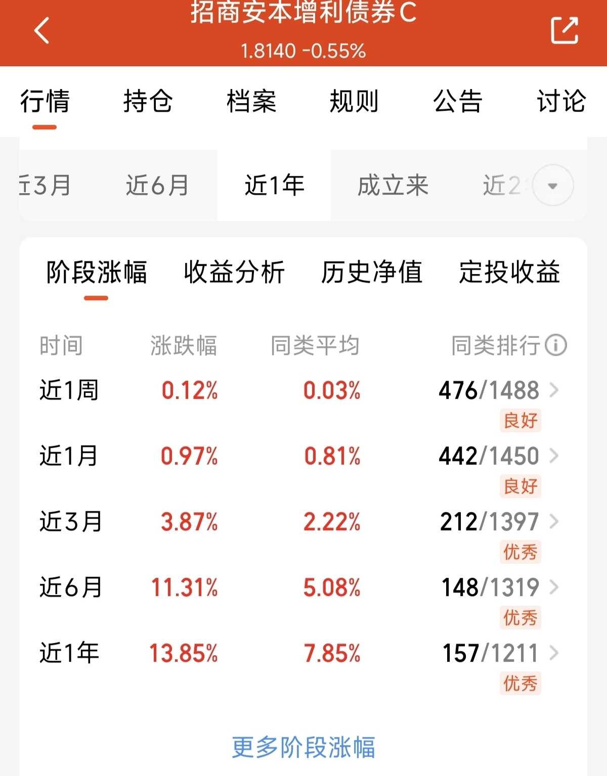 最近的市场。股债都有分化,还是混债的稳定性更好。$招商安本增利债券C$ 近一周收了12个蛋,长期表现的稳定性还是不错的。都是大幅跑赢了同类平均业绩,而且遇到波动回撤控制的好。长期稳定盈利的能力强。