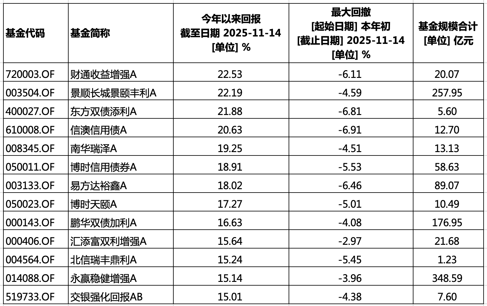 今年以来回报超过15%(沪深300涨幅为17.62%),且最大回撤小于7%(沪深300最大回撤为11.34%)的“非定开型”二级债基,按照收益率排名依次为:财通收益增强、景顺长城景颐丰利、东方双债添利、南华瑞泽、博时信用债券、易方达裕鑫、博时天颐、鹏华双债加利、汇添富双礼增强、北信瑞丰鼎利、永赢稳健增强、交银强化回报。