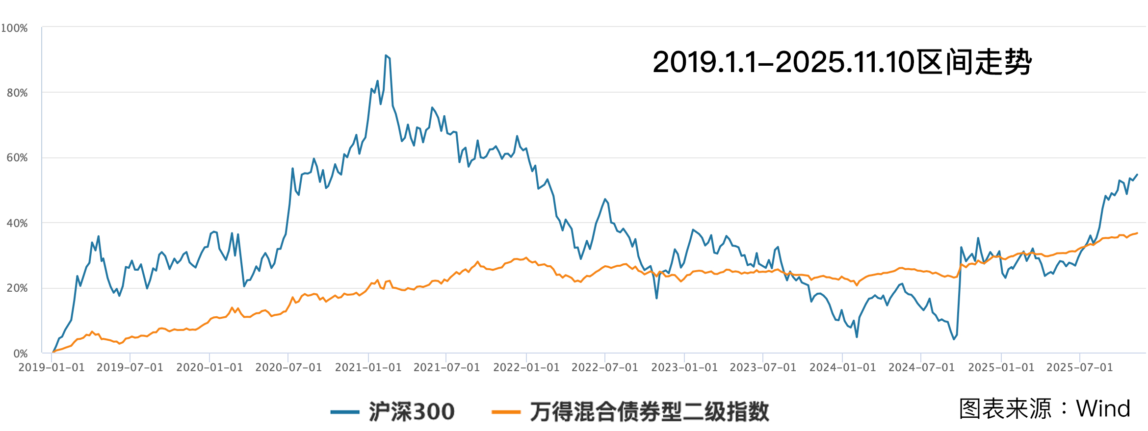 Wind统计显示,2019.1.1-2025.11.10区间,市场经历了“牛-熊-牛”行情,沪深300年化回报率为6.91%,万得混合债券型二级指数年化回报率为4.87%。二级债基虽然表现稍微逊色,但是年化波动率为4.29%,远远小于沪深300指数的19.12%波动率。