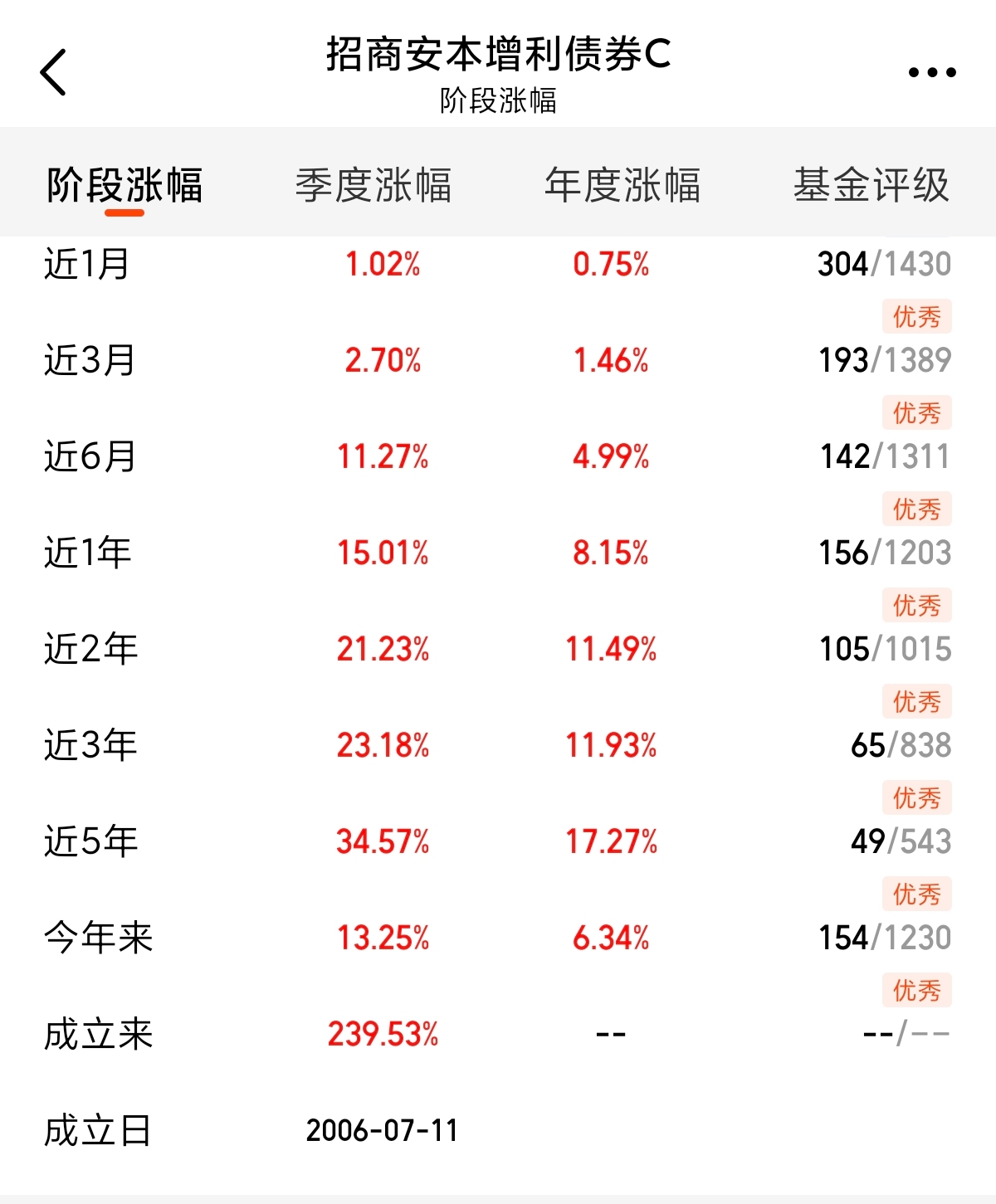 自2006年7月成立以来,招商安本增利债券C累计回报达239.61%,年化收益6.52%,年初至今收益率超13%,稳居同类前列。$招商安本增利债券C(OTCFUND|217008)$