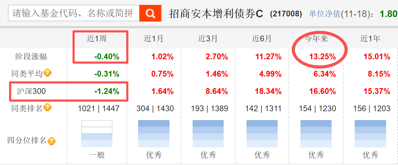 当初选这只是发现,招商安本增利债券C作为一个二级债基,今年涨幅超13%,接近纯股票的沪深300涨幅,是真的强!