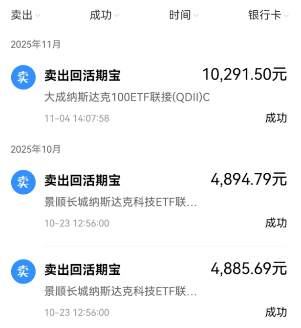 10月底清仓$景顺长城纳斯达克科技ETF联接(QDII)C人民币(OTCFUND|017093)$,11月4日又减仓了一万多的$大成纳斯达克100ETF联接(QDII)C(OTCFUND|008971)$