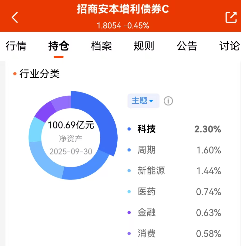 但是招商安本增利债券的股票仓位是均衡配置科技、周期、新能源、医药、金融、消费,不仅有今年热门板块,也有抗跌的低位板块。